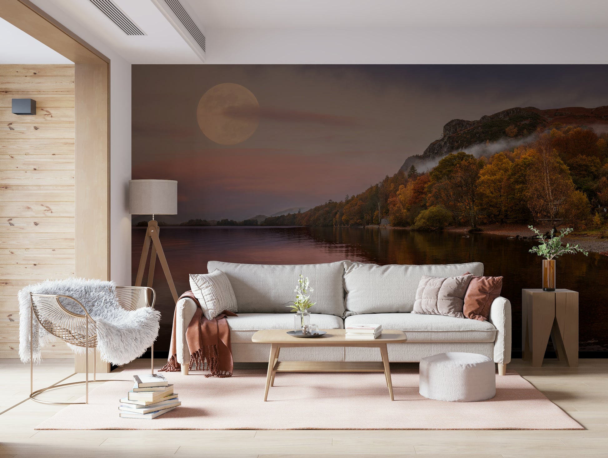 Transform your space with this captivating wallpaper for walls, showcasing a serene lake landscape at dusk. The design features trees in full autumn colour, reflecting in the calm water under a soft, glowing moon. Hues of orange, brown, and pink create a peaceful and inviting atmosphere. This image works perfectly in a bedroom, living room, or office, bringing a touch of the outdoors inside and providing a calming backdrop for any interior style.