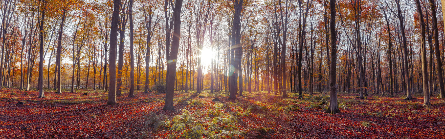 Sunlight through trees. Embrace the warm glow of autumn with this captivating forest scene. The vibrant oranges and reds of the leaves contrast beautifully with the stark silhouettes of the trees, as sunlight streams through the canopy. This wallpaper for walls brings a touch of the outdoors inside, making it perfect for creating a cozy atmosphere in your living room, bedroom, or office. It will transform interiors into a serene, inviting space that evokes a sense of calm and natural beauty.