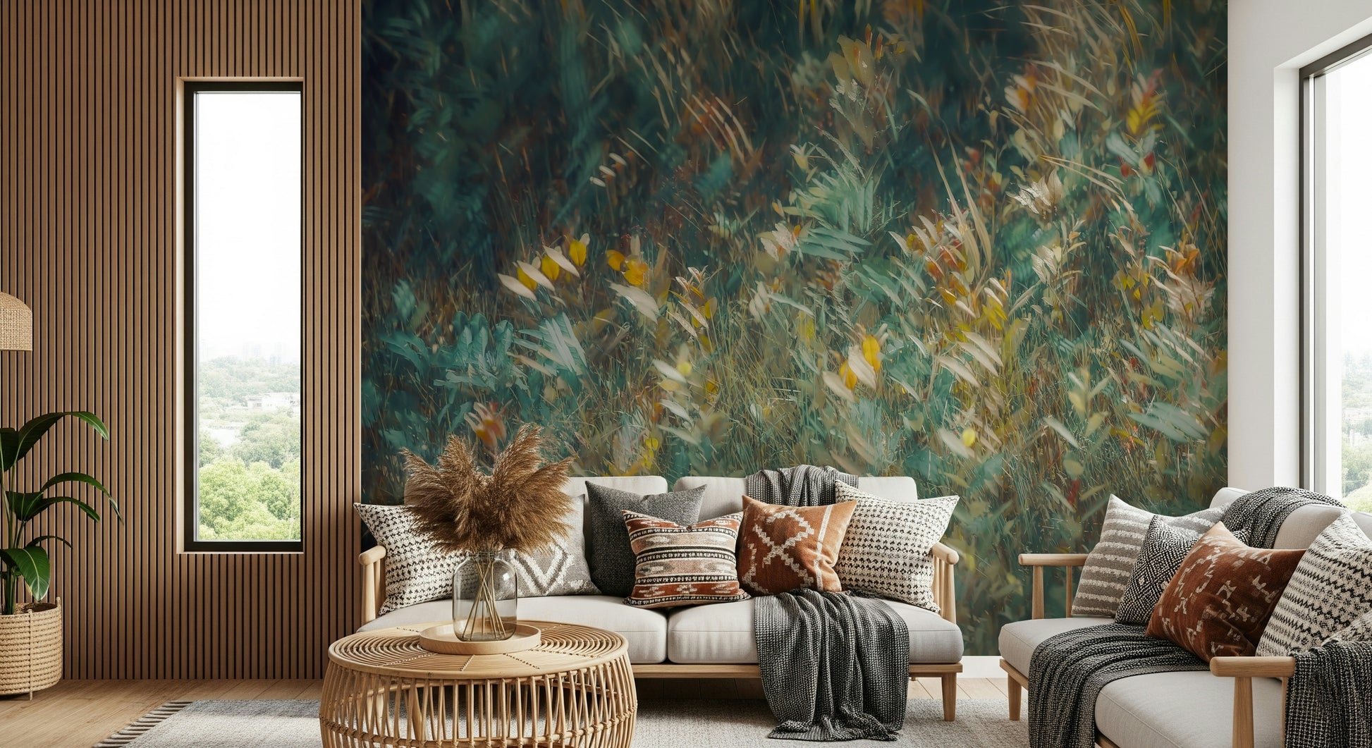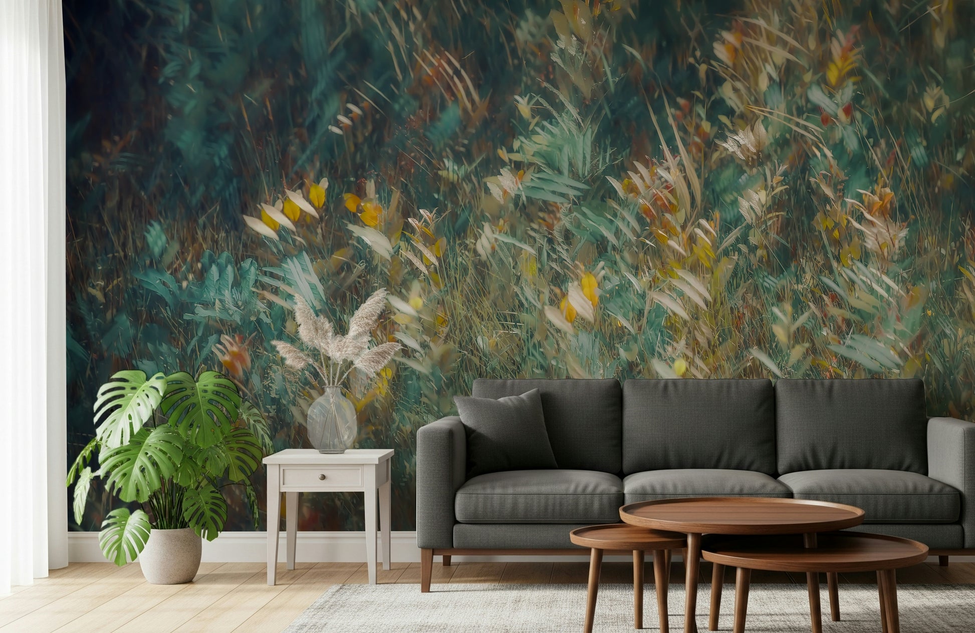 Transform your space with this soothing wallpaper. The design showcases a field of grass and leaves in muted tones of yellow, green, and brown, creating a tranquil and inviting atmosphere. It brings the beauty of the outdoors into your home. This wallpaper for walls offers a calm, natural aesthetic that complements living rooms, bedrooms, or studies. The subtle palette ensures the design pairs well with various furniture styles and colour schemes, enhancing your interiors with a touch of understated elegance.