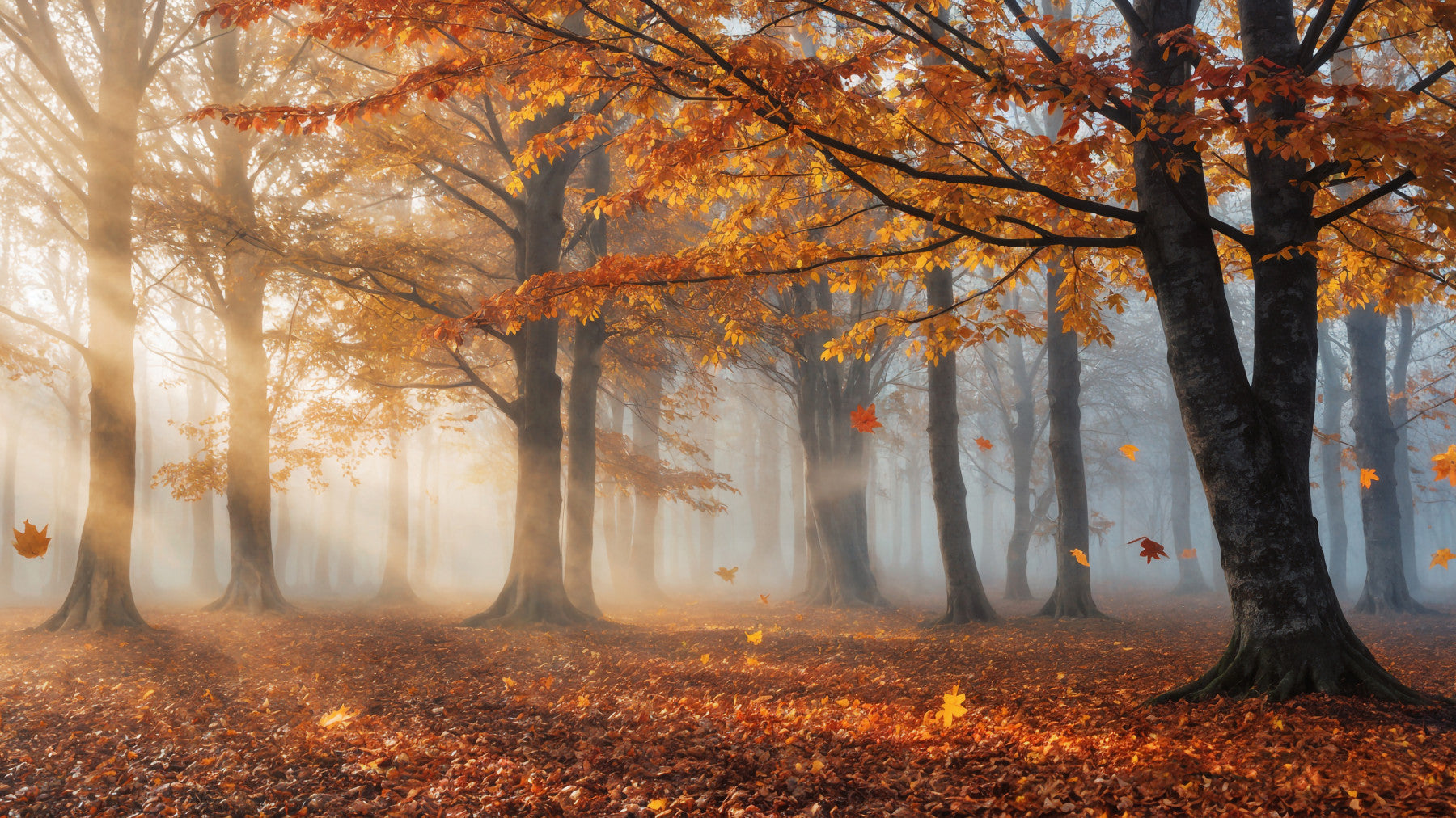 This captivating wallpaper for walls brings the serene beauty of autumn indoors. Sunlight filters through the trees, creating an enchanting, dreamy atmosphere. The image highlights a forest scene with orange and brown leaves blanketing the ground and trees. It works well in any room where you desire a cozy, nature-inspired design. Transform your living room, bedroom, or office with this inviting landscape that evokes a sense of peace and warmth. The colors and lighting in this design will complement interiors looking to create a natural look.