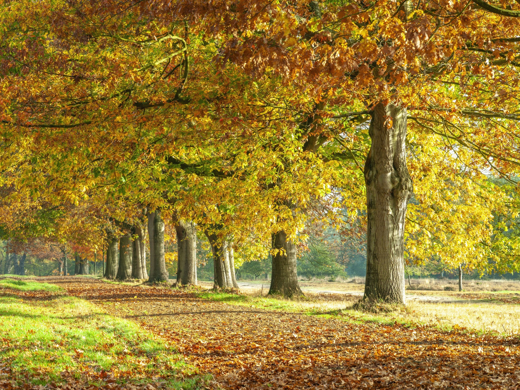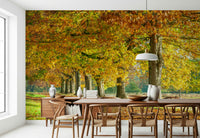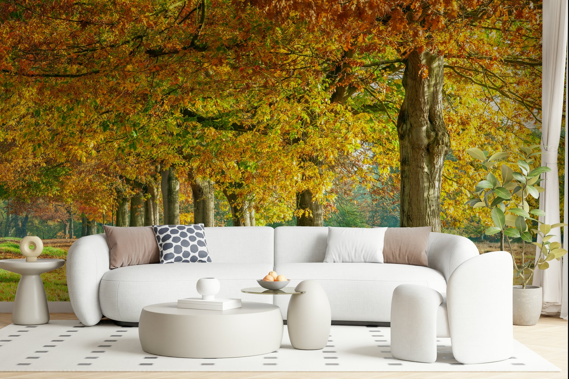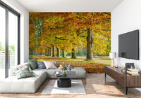 Row of trees with autumn colours. Step into a world of golden hues with "Autumn's Avenues." This wallpaper captures the essence of fall, showcasing a breathtaking avenue of trees adorned with vibrant foliage. A sun-drenched path invites you to wander through a canopy of leaves, painted in shades of gold, yellow, and amber. The crisp air and the rustling sound of fallen leaves underfoot are almost palpable, bringing the serene beauty of an autumn day directly to your screen. Ideal for those seeking a touch of seasonal warmth and natural elegance, this wallpaper transforms any device into a portal to a tranquil autumnal escape. Immerse yourself in the beauty of nature's grand finale as the trees prepare for winter, leaving behind a spectacle of colour and light.