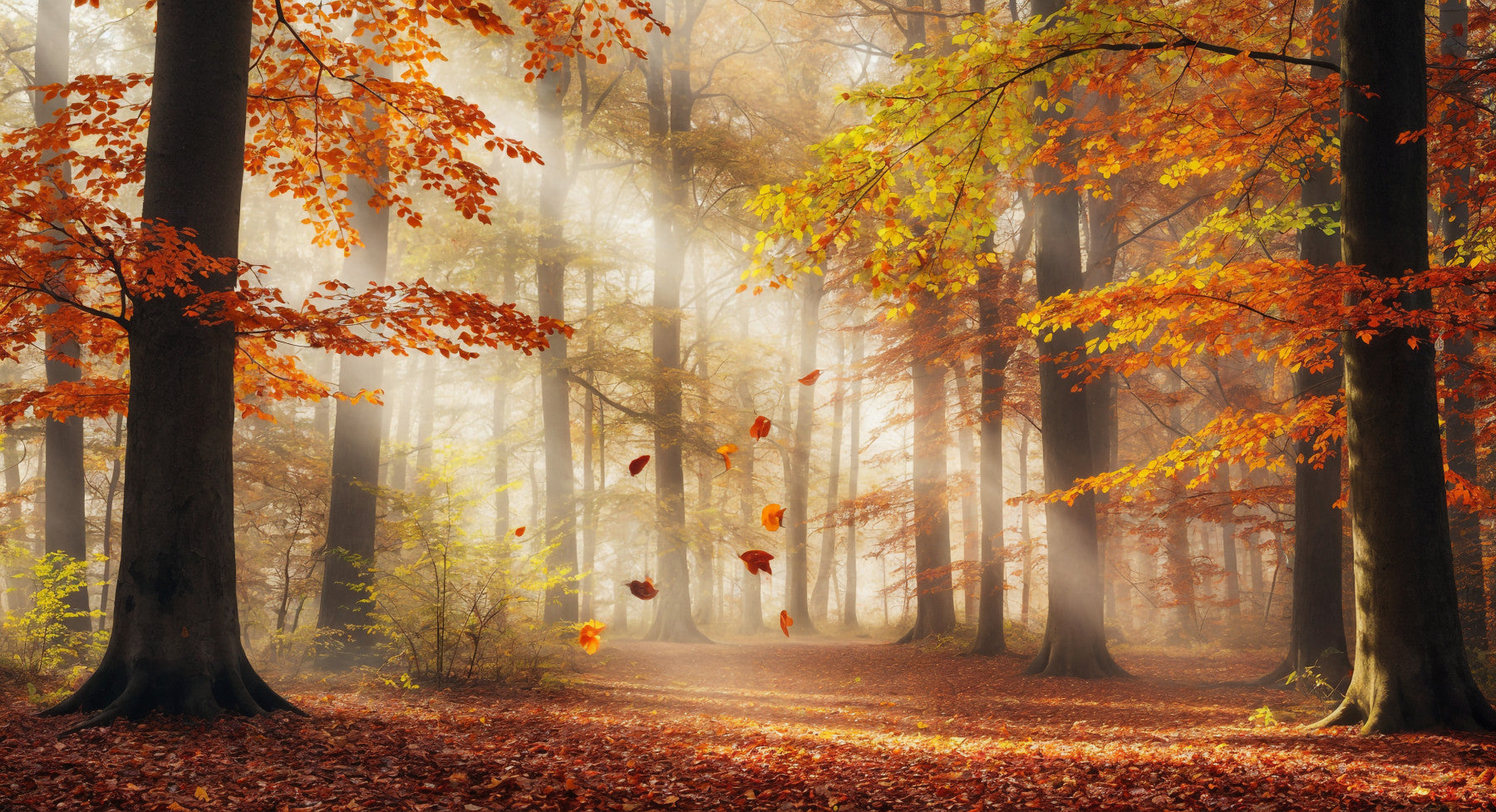 Bring a warm seasonal look into your space with Autumn's Embrace Wall Mural. The golden foliage and soft woodland depth suits modern interiors without overpowering the room. Use it as a living room feature wall behind a sofa, or in a bedroom behind the headboard for a calm, cozy backdrop. It also works well in an apartment hallway to add visual interest along a long wall, or in a home office behind a desk for a grounded, warm color setting on calls. Pair it with light woods, neutral furniture, and simple wall decor so the artwork stays clear. For best results, use warm white lighting and keep surrounding patterns minimal.