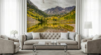 Immerse yourself in the beauty of nature with this amazing wallpaper. Capture the scenic vista of mountains and their mirror-like reflections on the still waters of a lake. The vibrant foliage adds charm to this scenery with its gradient shades of yellow and green. The cloudy sky adds depth and drama. This wallpaper for walls complements various interiors, from minimalist to rustic styles, especially in a living room, dining room, or even a hallway. Create a stunning feature wall.