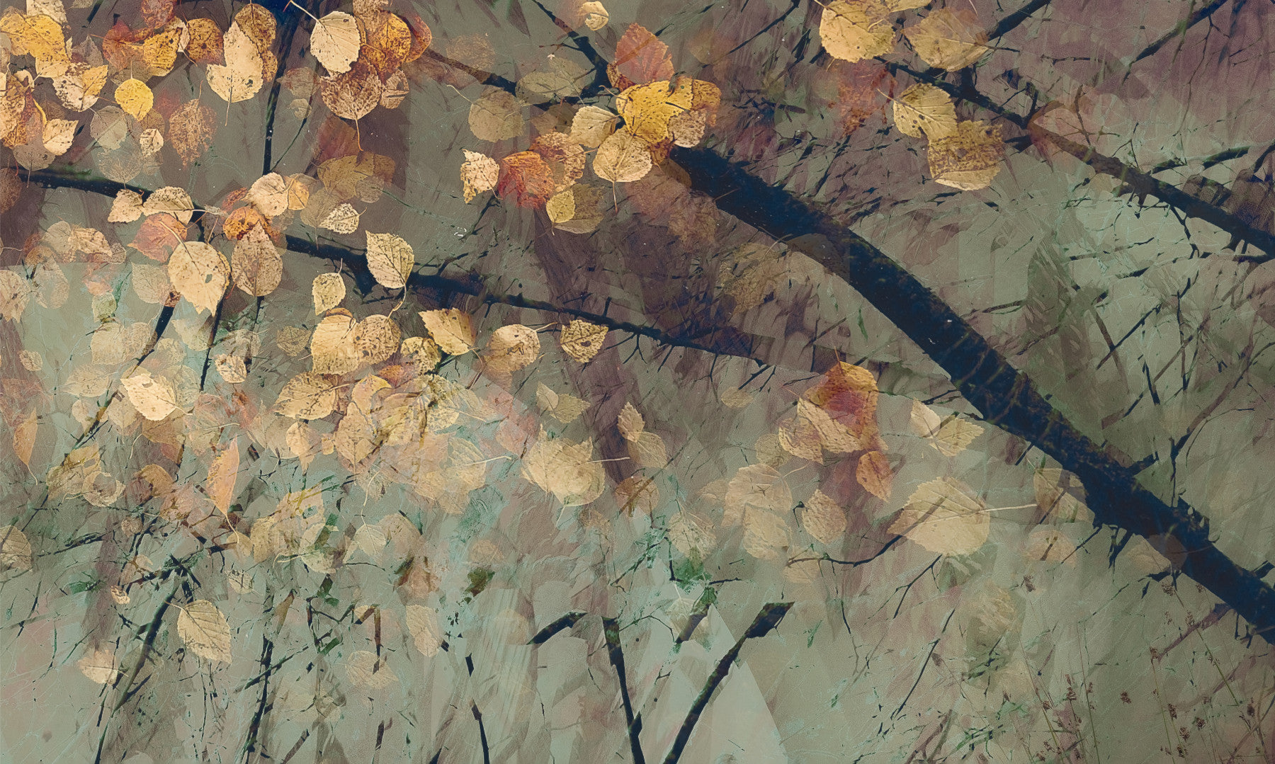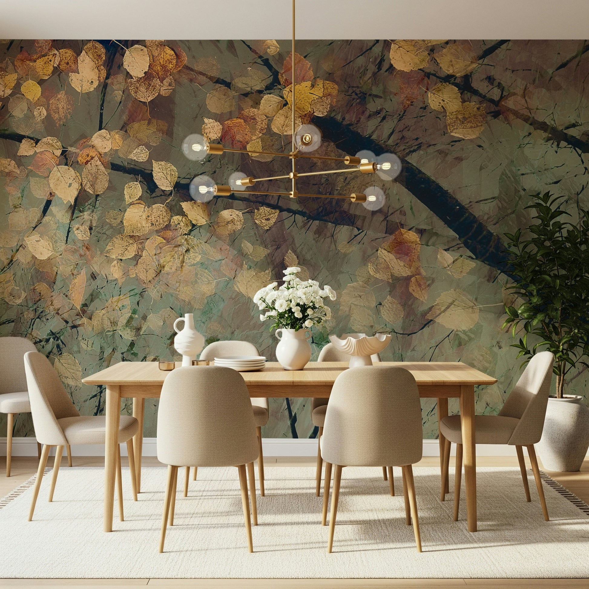 Invite a peaceful autumn atmosphere into your living space. This elegant wallpaper for walls showcases delicate leaves and branches reflected on a calm surface, creating a soft and serene aesthetic. The warm beige and brown tones blend with subtle hints of blue and green, making this design ideal for bedrooms, living rooms, or offices. It complements various interiors from rustic to modern, adding a touch of nature and tranquility to any room.