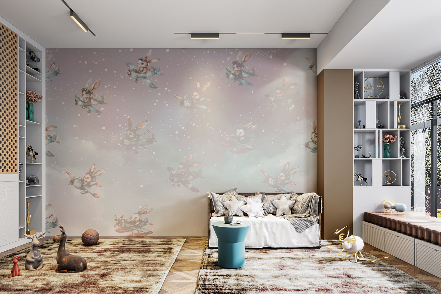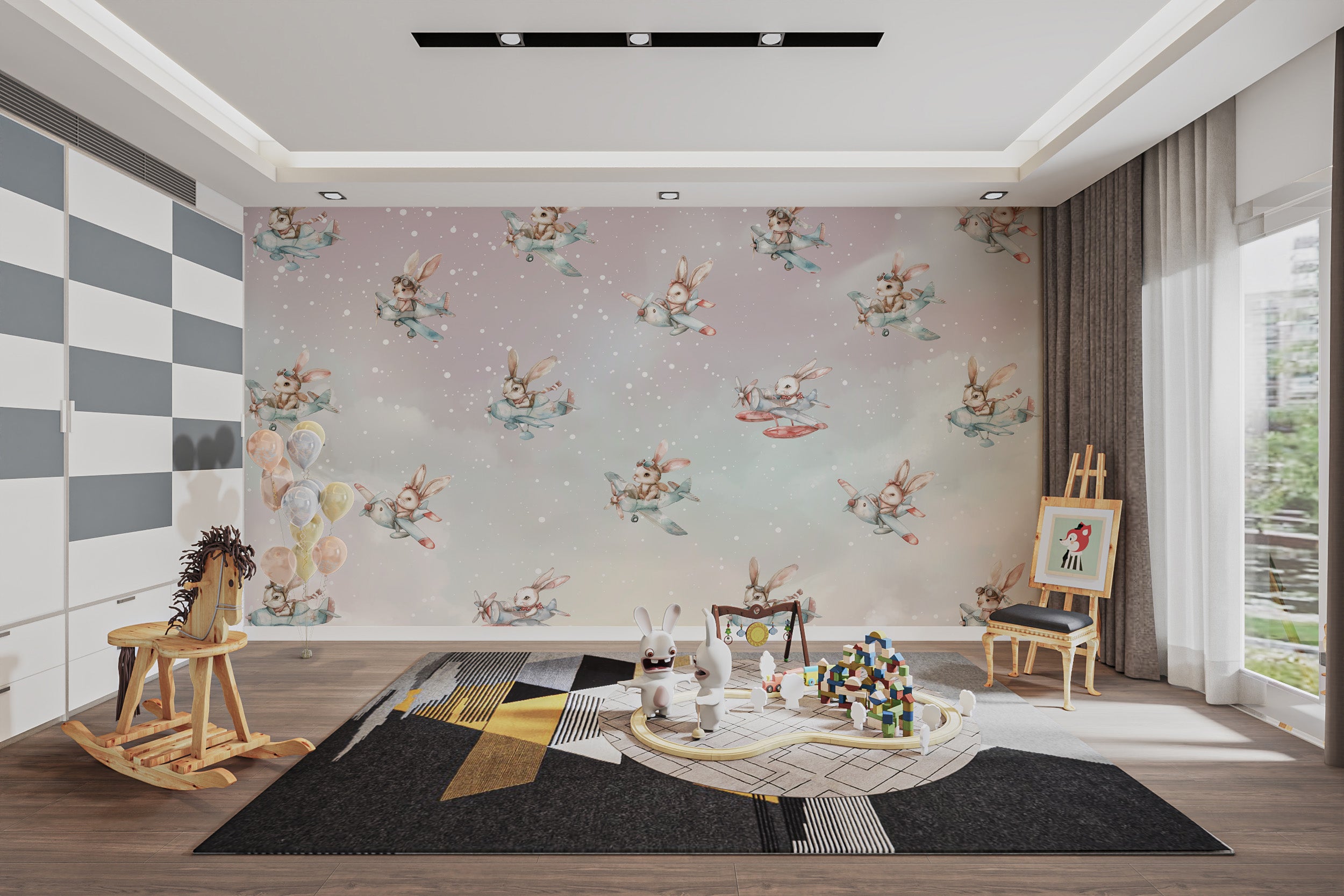 Kids wallpaper featuring bunnies piloting vintage-style airplanes.