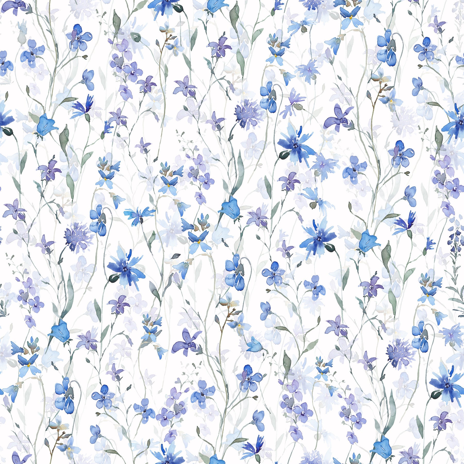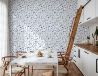 Transform your living space with this delicate watercolour floral wallpaper for walls by Uta Naumann. Soft blues and lavender hues intertwine with gentle green stems, creating a serene and calming atmosphere. The hand-painted style offers a touch of artistry, perfect for bedrooms, nurseries, or any room where a touch of nature's beauty is desired. This design brings a fresh and airy feel, brightening your interior and complementing light-coloured furniture. It is a stylish choice to add subtle charm and a peaceful elegance to your home.