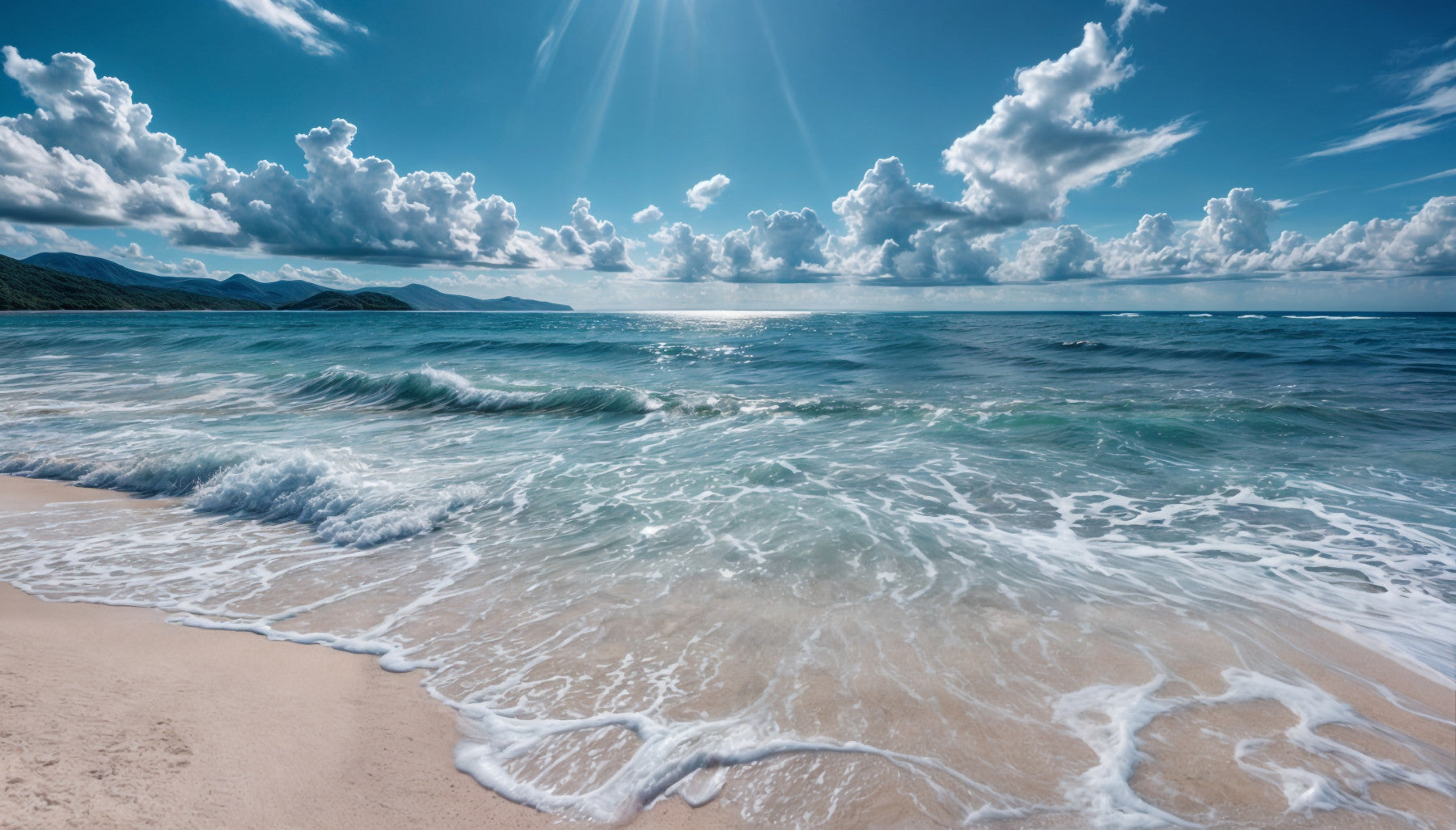 Panoramic azure horizon mural in lounge, airy blue and white palette
