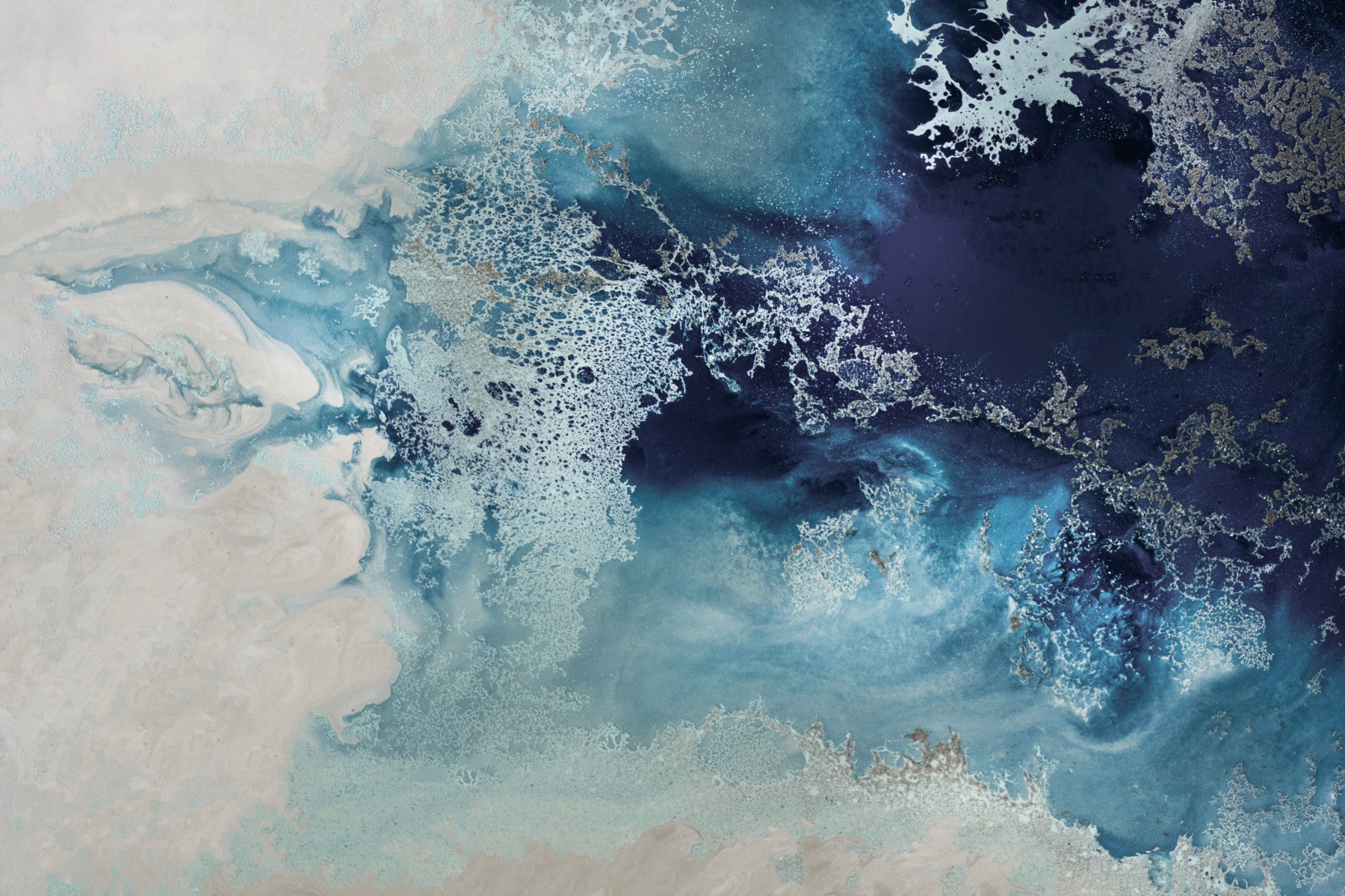 This mesmerizing wallpaper brings the serene beauty of the ocean into your living space. Delicate swirls of light blue blend seamlessly with deep navy, creating a tranquil atmosphere. The textured pattern suggests seafoam and underwater currents. Touches of silver add subtle hints of shimmer. Use this wallpaper for walls in bedrooms or bathrooms to evoke a sense of calm. The design complements minimalist interiors, coastal themes, or adds an artistic touch to modern rooms.