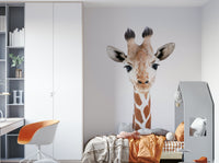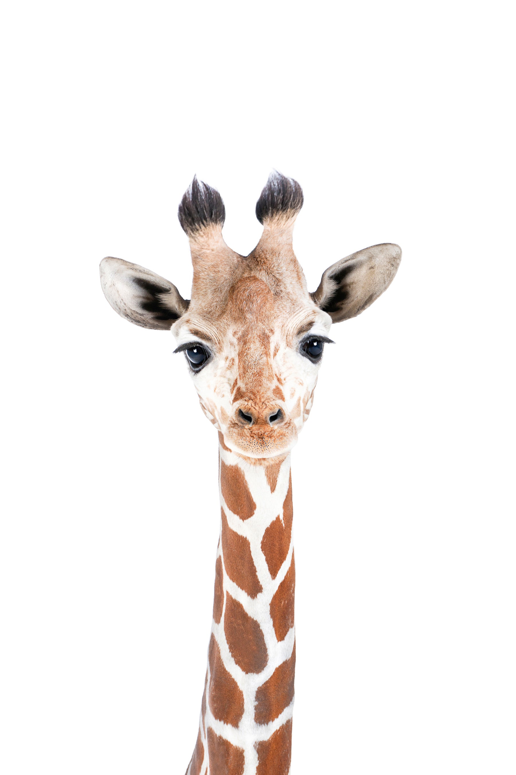 An adorable close-up of a baby giraffe's head and neck, set against a pristine white background. Its large, expressive eyes and soft, fuzzy coat are captivating. The intricate pattern of its iconic brown and white spots is beautifully detailed, highlighting the unique markings of this young creature. This wallpaper evokes feelings of warmth, innocence, and wonder, bringing the charm of the African savanna to your screen. Perfect for adding a touch of whimsical elegance and gentle beauty to your device.