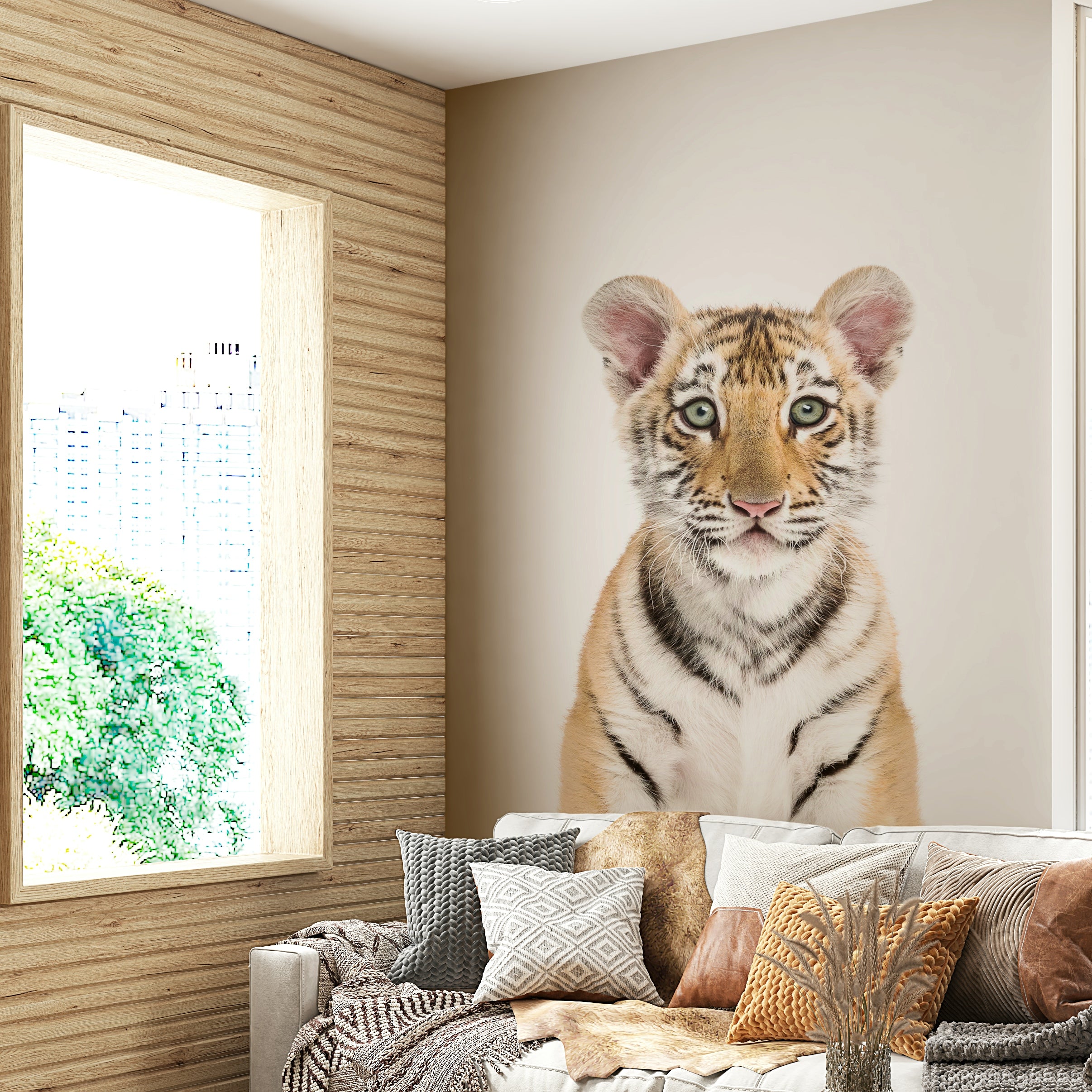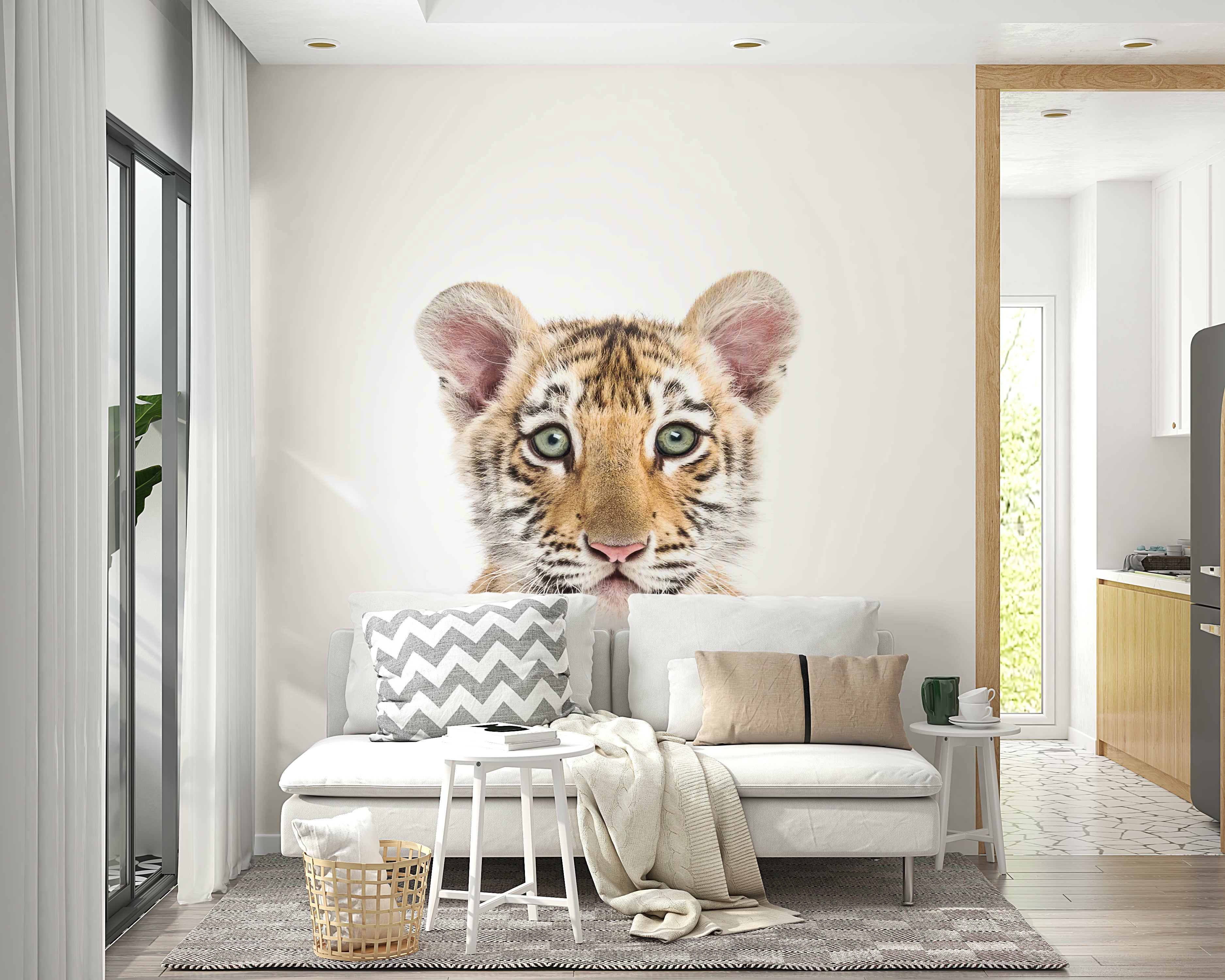 An adorable close-up of a baby tiger cub against a pristine white background. Its captivating emerald green eyes and soft, fluffy orange and black striped fur are beautifully highlighted. The image exudes a sense of innocence and wonder, capturing the raw beauty of this majestic creature in its most vulnerable stage. Perfect for nature lovers and anyone who appreciates the charm of wildlife, this wallpaper brings a touch of wild beauty to any digital device.