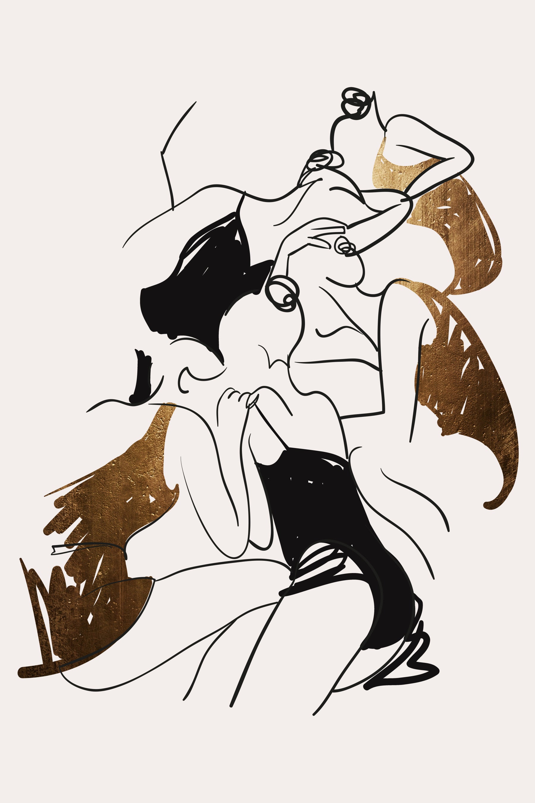 Elegance in motion, captured in minimalist strokes. This wallpaper titled "Ballerinas" offers a contemporary interpretation of the classic dance, portraying a group of dancers in varying poses of rest and preparation. The black ink lines gracefully outline their figures, creating a sense of fluid movement frozen in time. Interspersed among the lines are patches of textured gold, adding a touch of luxury and warmth, hinting at the dedication and the spotlight that defines the world of ballet. This design celebrates the strength and poise of the ballerinas, making it an ideal choice for anyone seeking a sophisticated and artistic accent for their digital space. The overall aesthetic is modern, clean, and evocative, creating a striking visual impact that is both subtle and captivating.