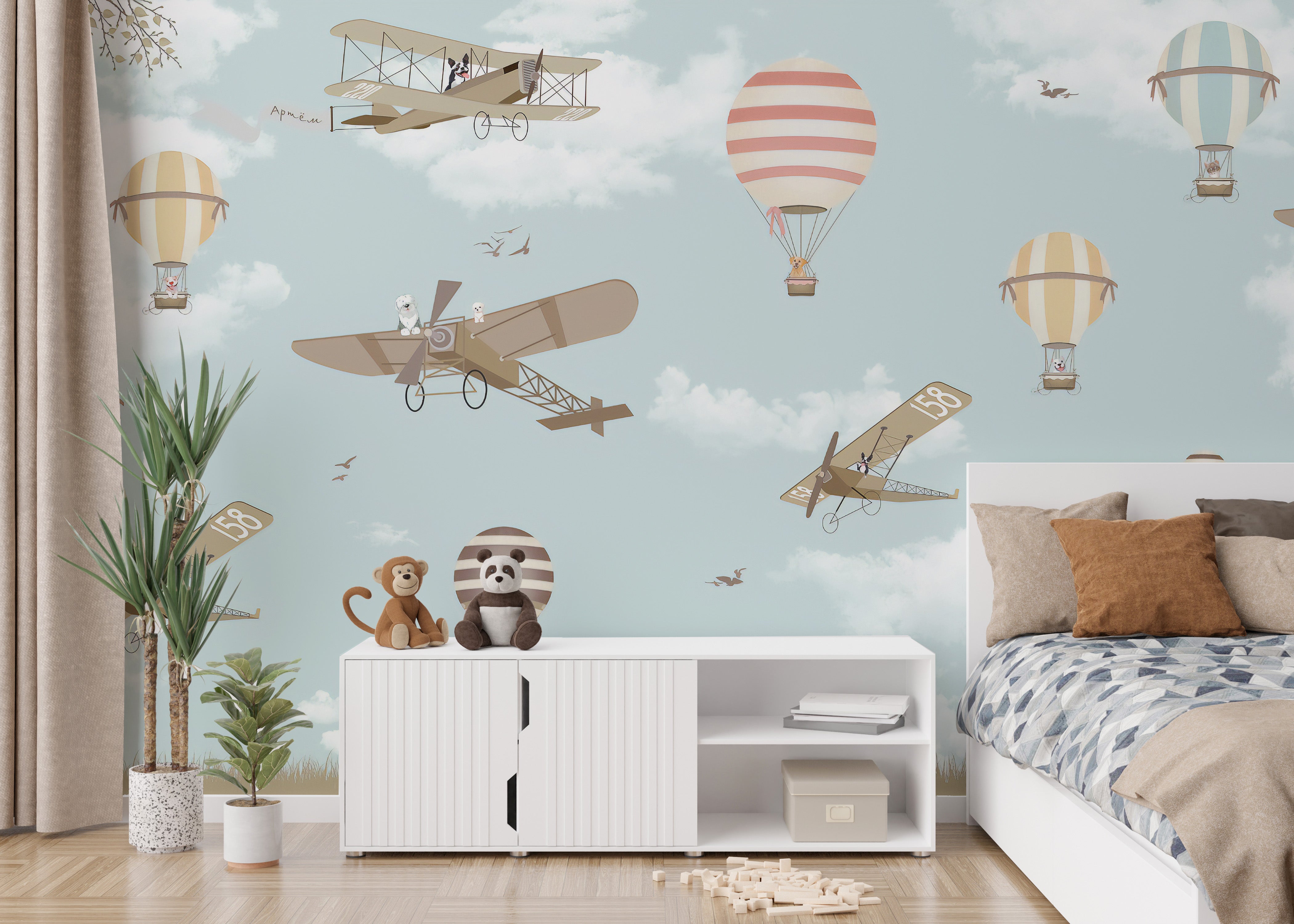 Imagine your little ones' eyes lighting up at their brand-new playroom. A stunning mural wallpaper of hot air balloons and planes adorns the walls, inviting them to fly high up into the sky for their next adventure. The vibrant shades and intricate details of the design help to stimulate their imagination and create a playful atmosphere. Let their creativity soar with a room that is both captivating and inspiring. It's the perfect way to add magic to your child's space.