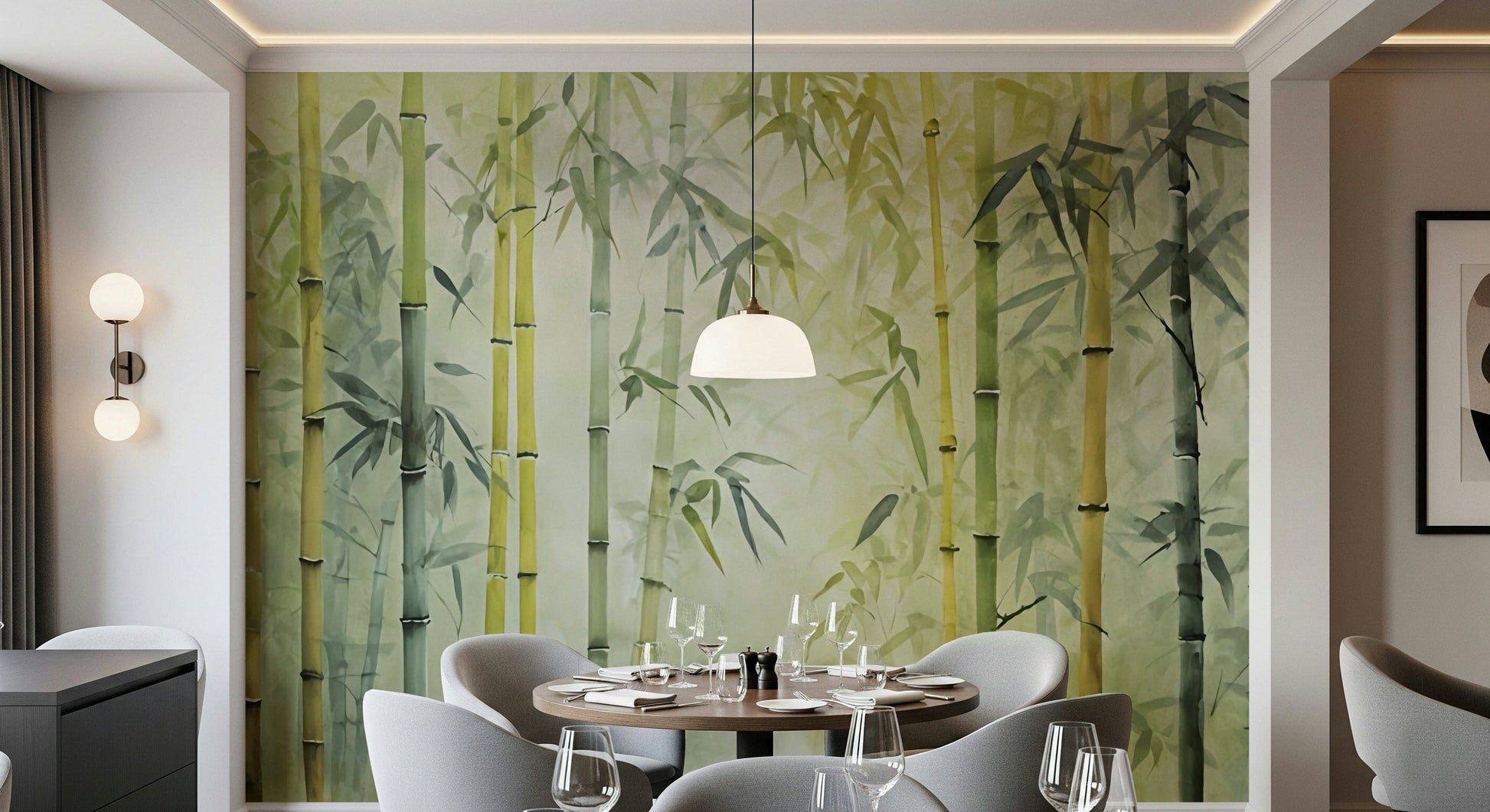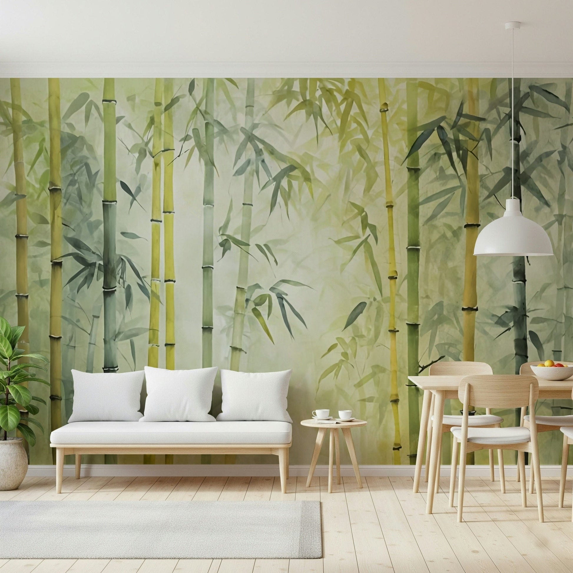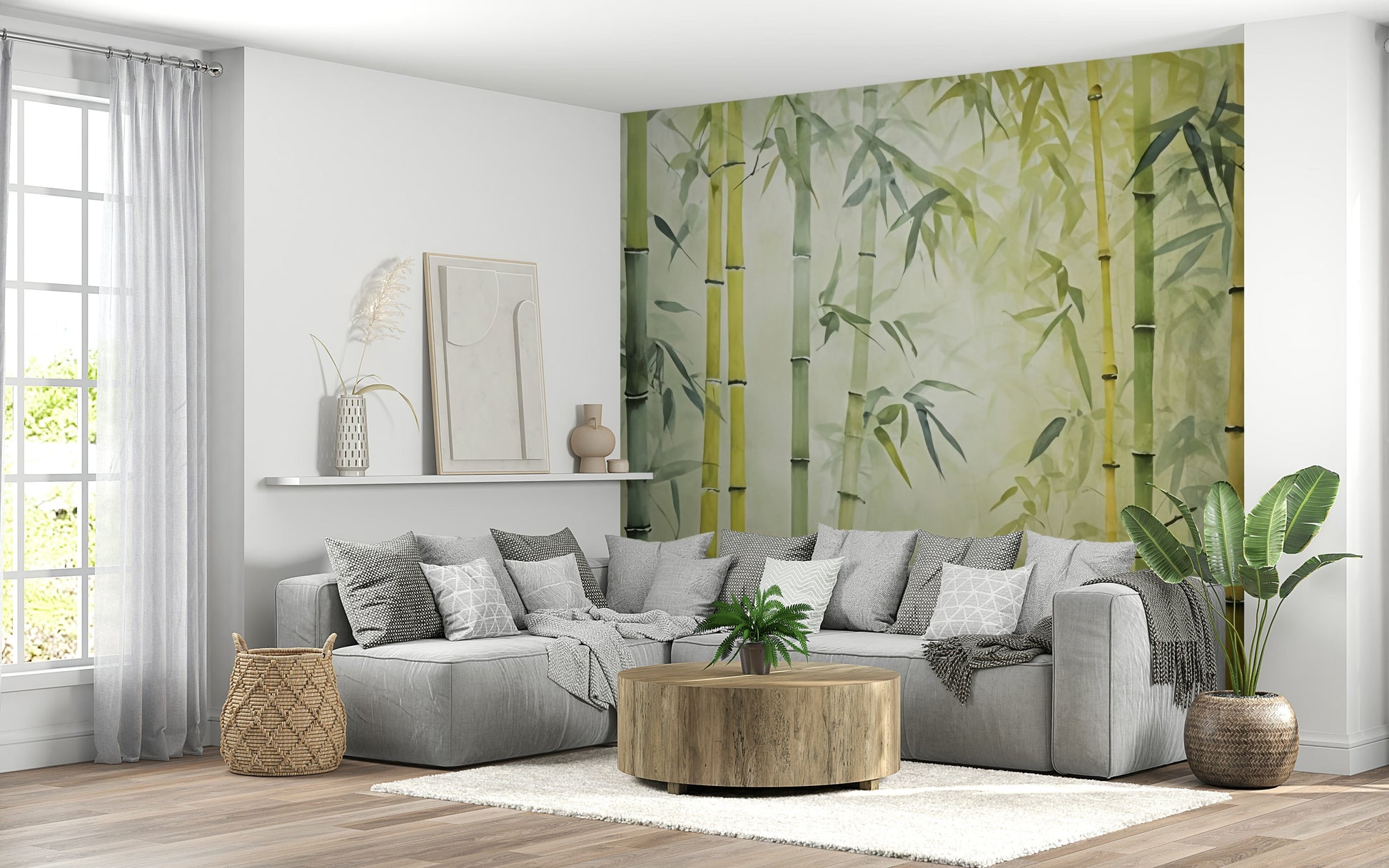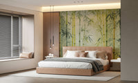 Infuse your interior with the tranquil charm of a bamboo forest. This wallpaper for walls captures the essence of nature through a muted colour palette of greens and yellows, creating a calming atmosphere in any room. The design features delicate bamboo stalks and leaves, evoking a sense of peace and serenity. It works exceptionally well in bedrooms, living rooms, or even bathrooms, adding a touch of nature's elegance to your space. This wallpaper enhances the feeling of spaciousness, making it ideal for smaller rooms that need a touch of the outdoors.