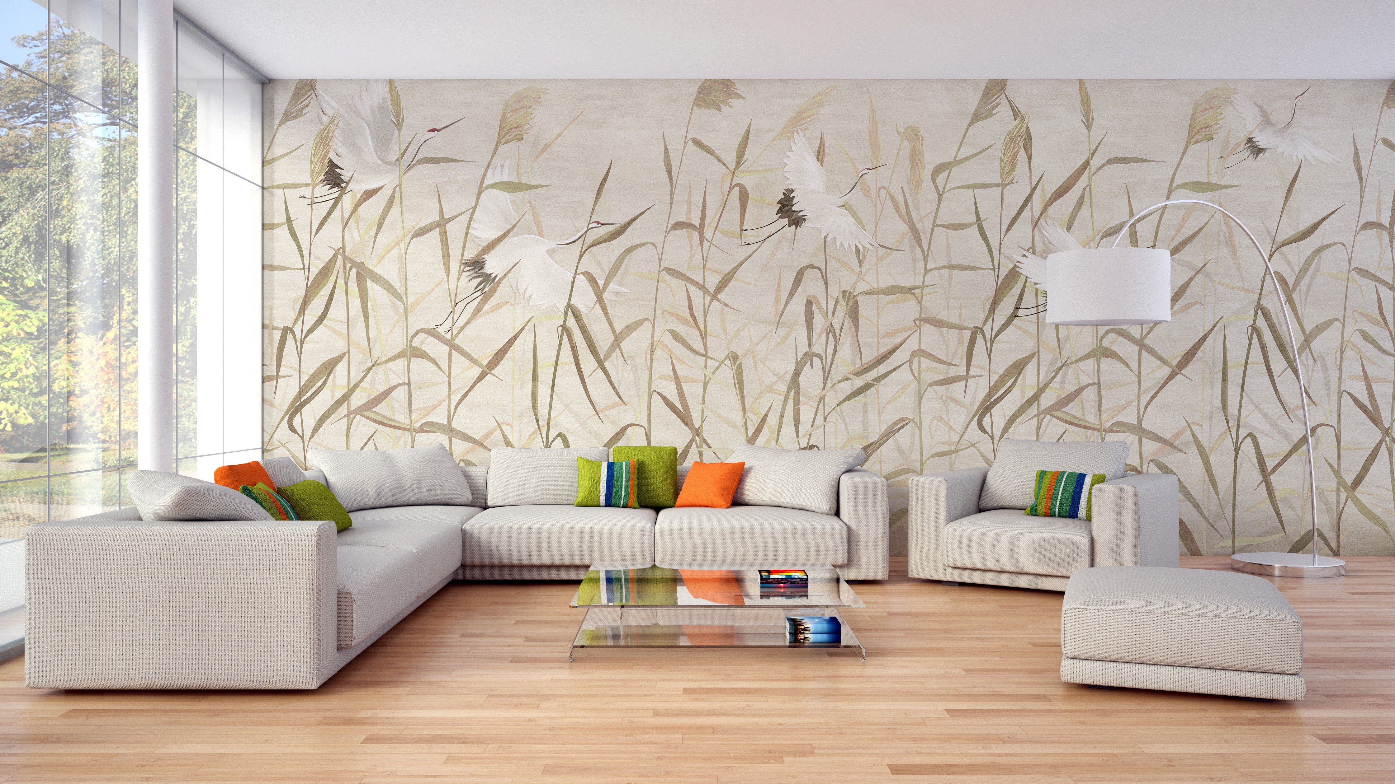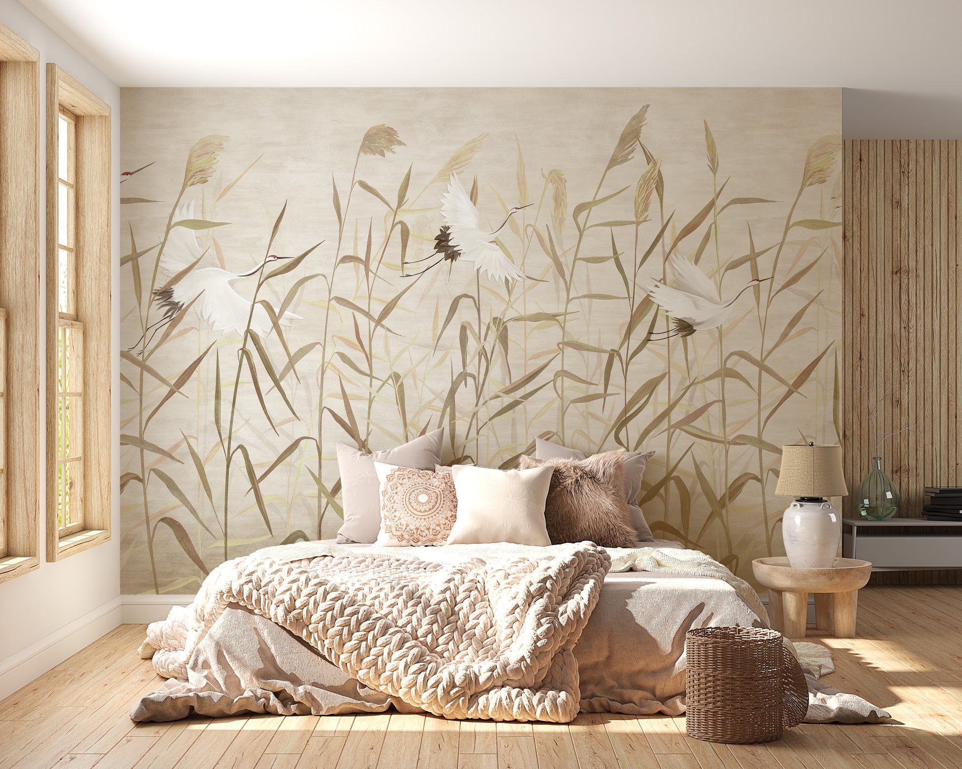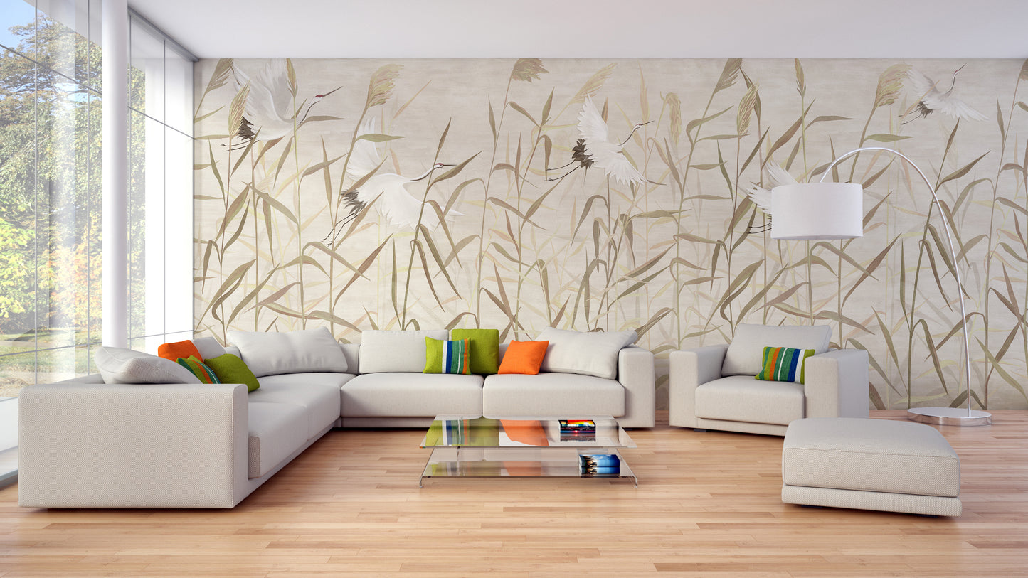 Immerse yourself in the serene ambiance of an exotic retreat with the Dusty Pink Tropical Forest Heron Birds Wallpaper. This artfully crafted mural brings a breath of tranquility into your home, showcasing a siege of graceful herons nestled amongst lush bamboo trees set against a charming dusky pink backdrop. Perfect for infusing a touch of elegance and calm into any room, from your stylish office to the cozy corners of a nursery.