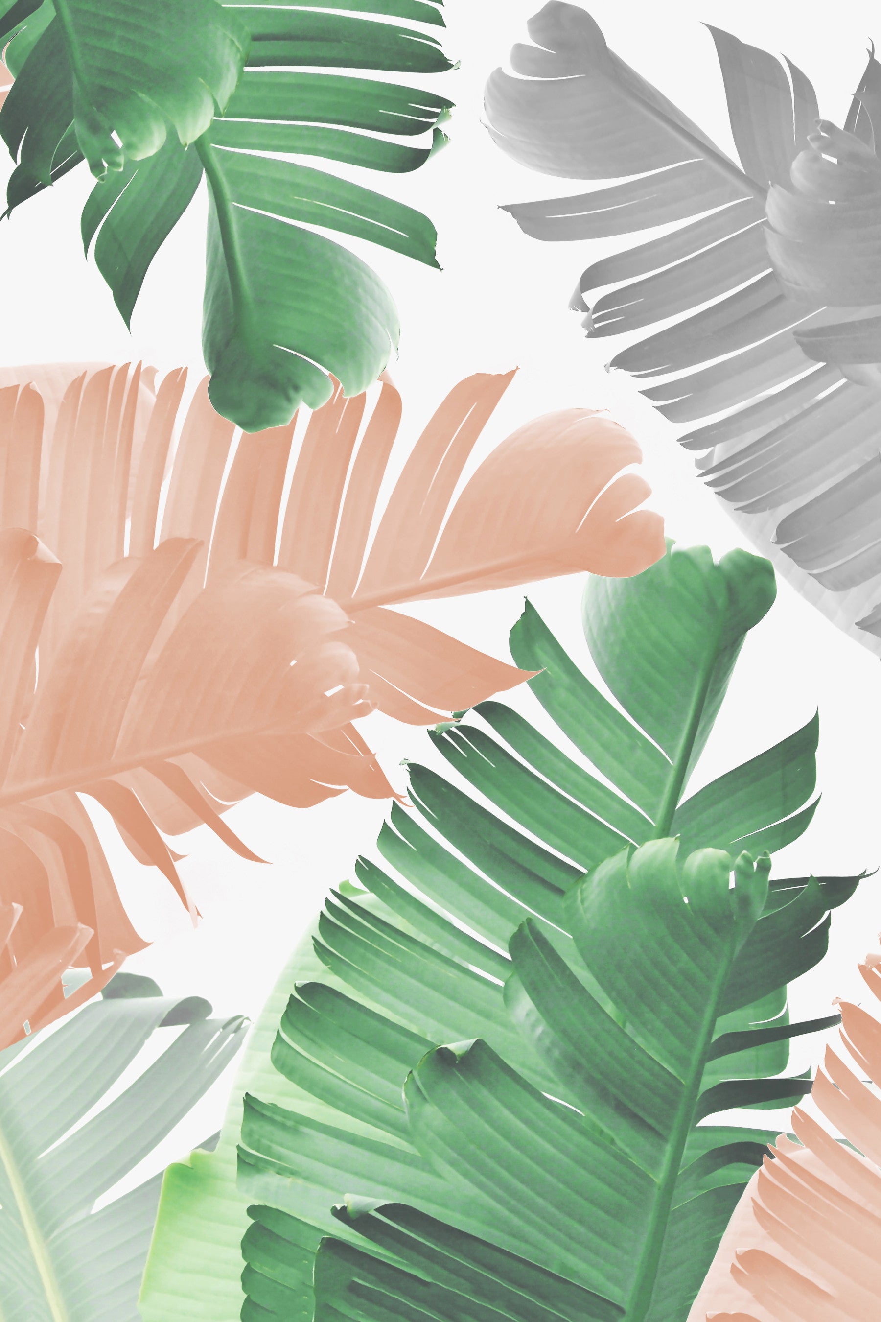 Dive into a vibrant world of tropical serenity with "Banana Leaf Play." This wallpaper showcases a playful arrangement of banana leaves in soft, pastel hues of green, peach, and grey. The leaves, rendered with a delicate, almost painterly touch, overlap and intertwine against a crisp white background, creating a visually captivating and calming effect. The subtle color palette and airy composition evoke a sense of peaceful relaxation, perfect for adding a touch of tropical elegance to any digital space. Experience the soothing rhythm of nature's artistry with this stunning wallpaper.