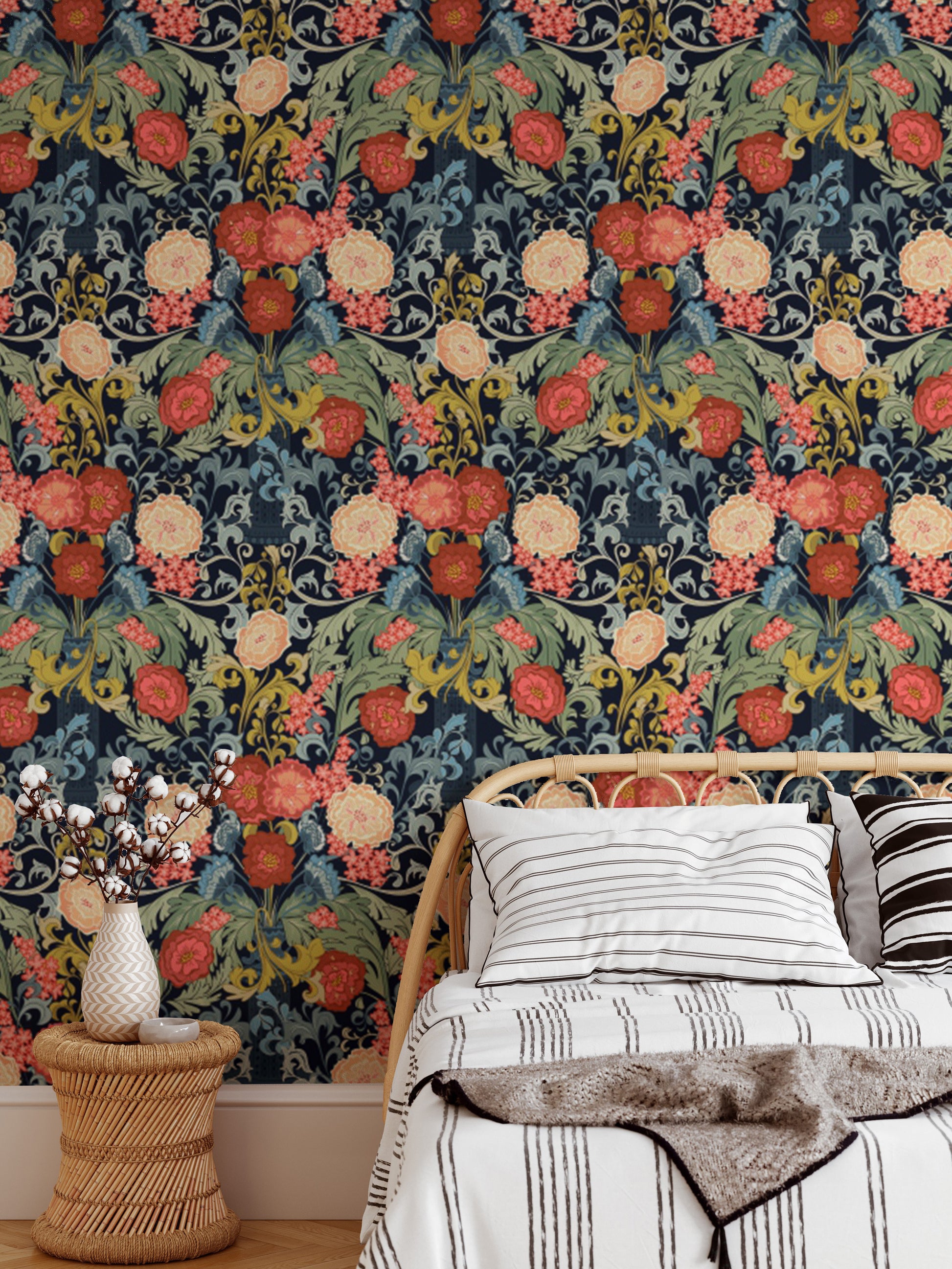 Adorn your walls with the timeless charm of Baroque Rose Mosaic Wallpaper. This exquisite pattern showcases a symphony of florals, where lush roses and tender blooms interlace against a rich, dark backdrop. Each detail is a nod to classic artistry, making it an ideal choice for those seeking to envelop their room in a canopy of botanical beauty. The depth of color and intricate detail ensure that this flower wallpaper acts as a stunning focal point in any setting. Whether creating a feature wall or enveloping an entire room, this wallpaper invites a sense of historical romance and artful craftsmanship into your home. It's not just a backdrop it's a journey to an era of baroque grandeur, wrapped in the romance of a garden in full bloom