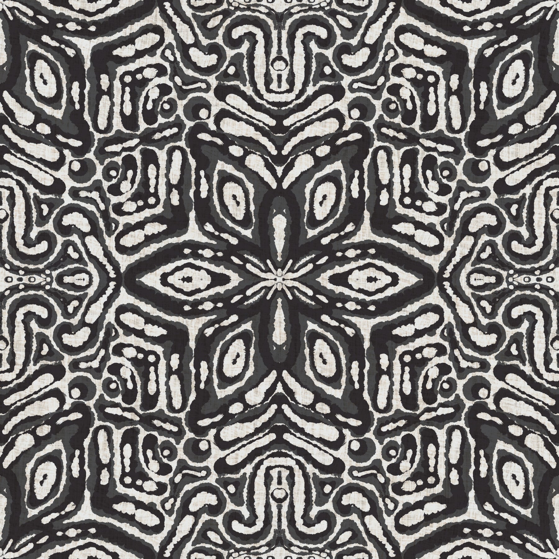 This wallpaper showcases a captivating blend of batik artistry and geometric design. A central, stylized flower motif commands attention, its petals rendered in shades of black and grey against a creamy off-white background.The monochrome palette adds a touch of sophistication and versatility, making it suitable for a range of interior styles. Experience the allure of traditional craftsmanship reimagined for the modern aesthetic.