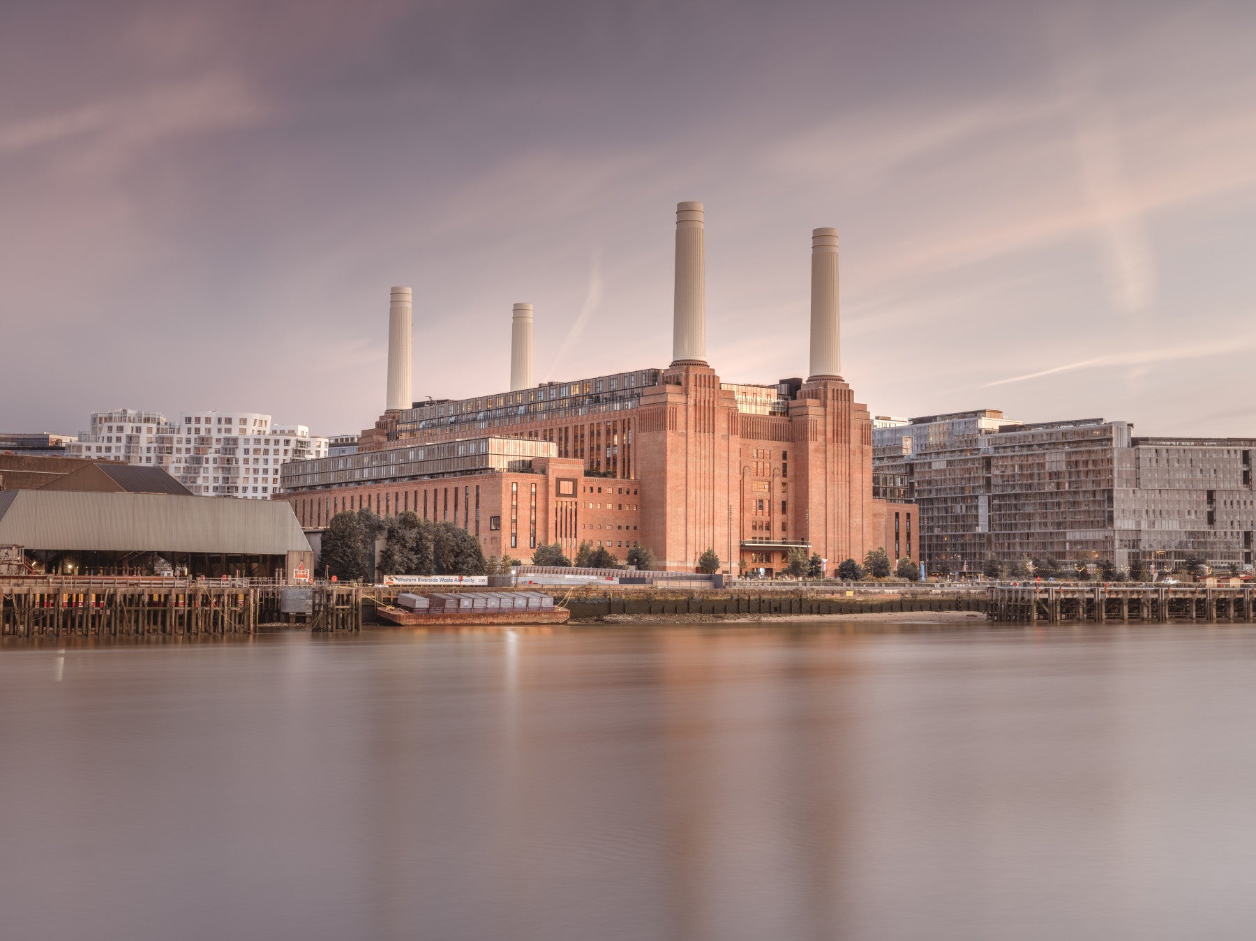 Transform your space with this captivating view of the iconic Battersea Power Station. The architectural marvel stands proudly against a soft, dusky sky, its colossal chimneys reaching towards the heavens. Reflected in the still waters of the Thames, the industrial masterpiece blends harmoniously with its urban surroundings. This image evokes a sense of history, resilience, and the enduring beauty of London's architectural heritage. The warm tones and serene composition create a calming yet powerful presence, perfect for adding a touch of sophisticated urban charm to any room.