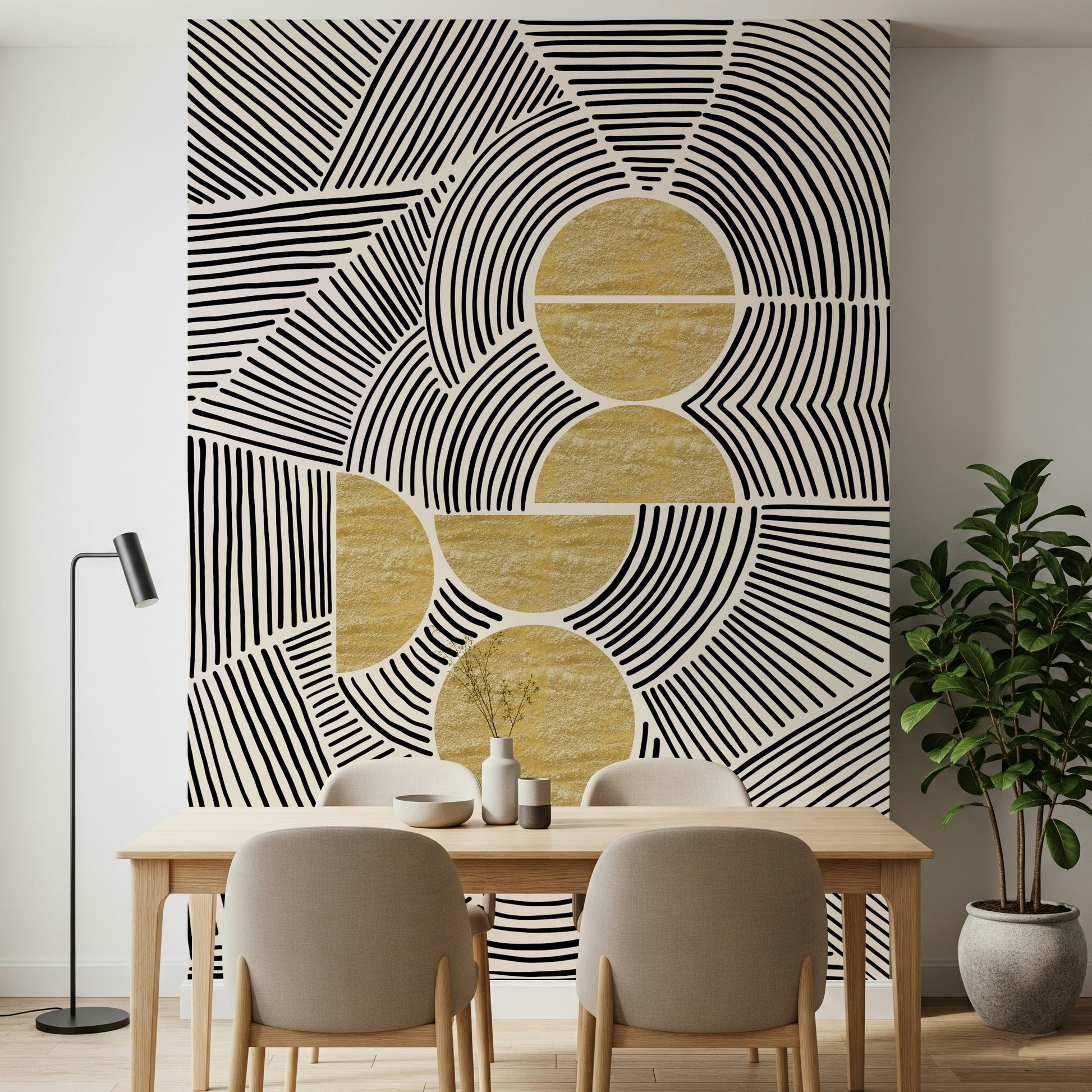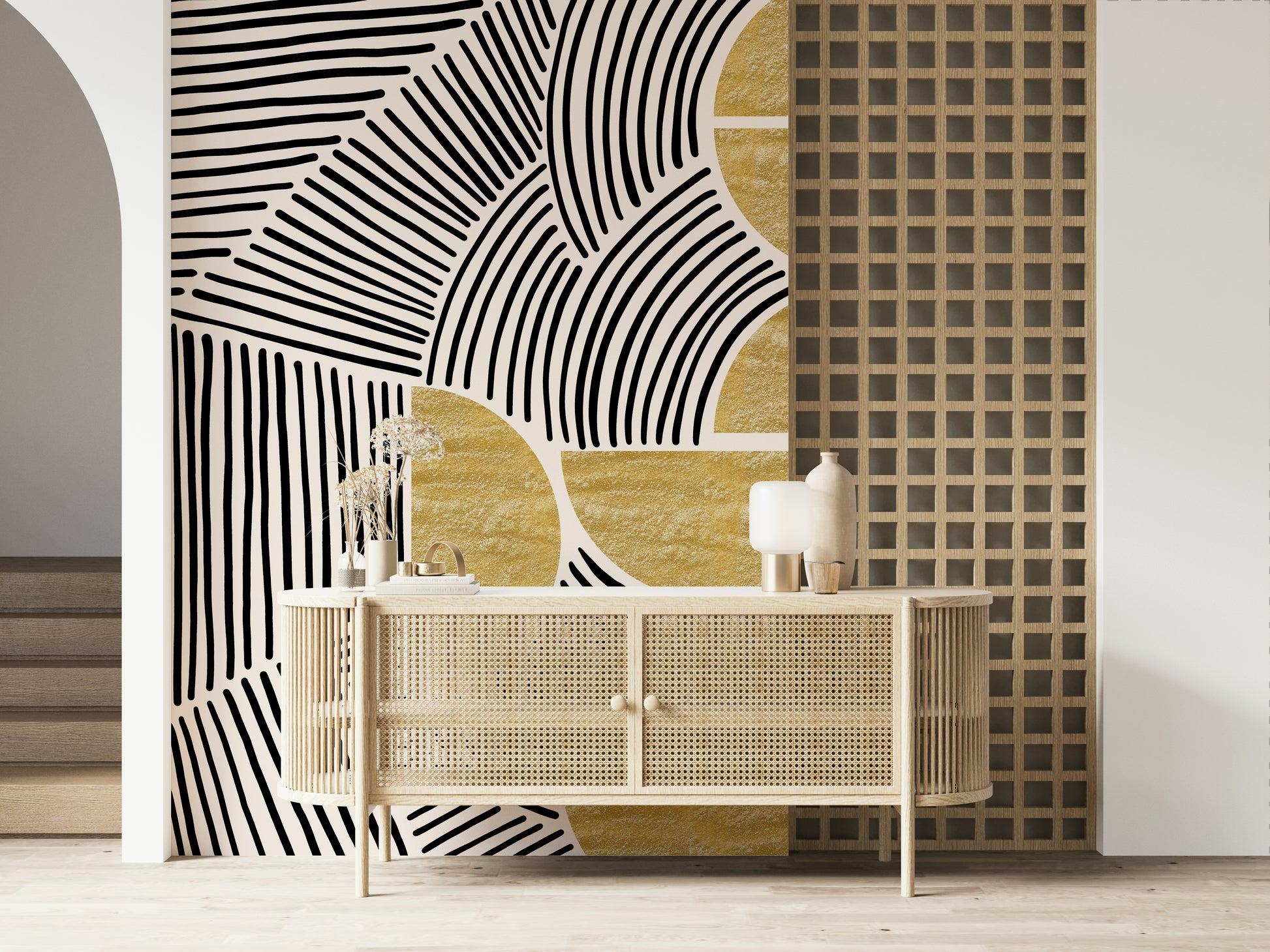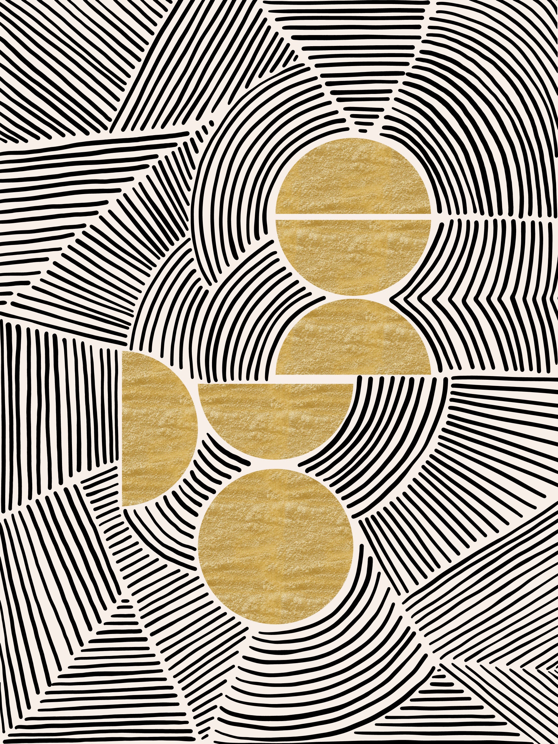 Infuse your interior space with the striking harmony of the "Bauhaus - Tribal" collection. This expressive wall decor piece melds the geometric precision of the Bauhaus movement with the raw, uninhibited energy of tribal art. Bold black lines dance across a neutral canvas, forming captivating patterns that evoke a sense of rhythm and ancestral connection. Intersecting shapes create visual complexity, guiding the eye through a stimulating landscape of form and texture. Accents of textured gold add a touch of luxurious warmth and primitive elegance, grounding the design in a sophisticated yet earthy aesthetic. Transform your wall into a focal point that celebrates both modernism and the timeless allure of indigenous artistry. Let this statement design create a feeling of dynamic, artistic exploration.