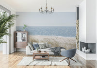 Capture the essence of a tranquil beach day with this detailed wallpaper for walls. The artwork features rippling water, fine sand, and beach grass. Its gentle blend of tans, blues, and neutral hues sets a soothing scene. This wallpaper will look beautiful in the bedroom, living room, or office. It is especially well suited for spaces seeking a relaxed or casual design to complement wooden furnishings and natural light.