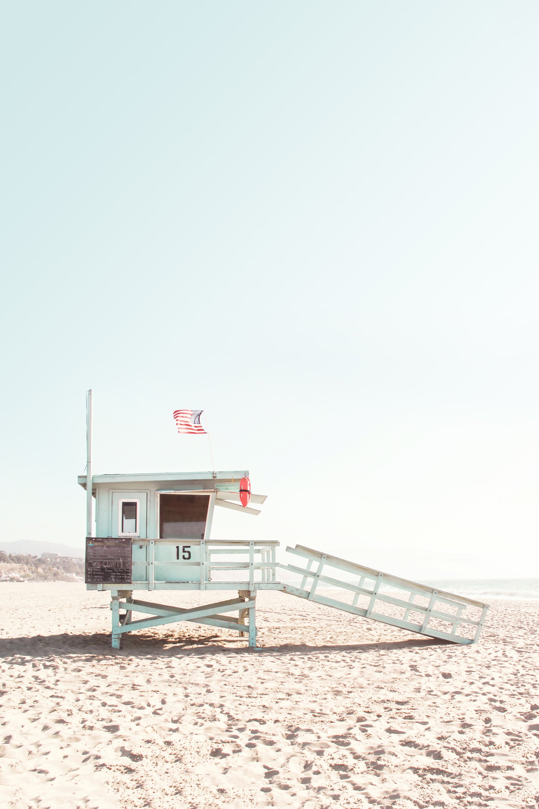 Bring the tranquility of the coast to your home with this striking wallpaper for walls. The image features a lifeguard stand on a sandy beach, complete with an American flag gently waving. The light blue of the stand contrasts beautifully with the beige sand and pale sky. This scene creates a calm and inviting atmosphere, perfect for a bedroom, bathroom, or living room. The simple, clean lines and muted tones complement a variety of interior design styles, from coastal to modern minimalist.