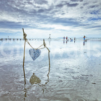 Heart tied up on wooden sticks at the beach. Immerse your space in the tender embrace of "Beach Love," a tranquil vista that captures the heart of coastal serenity. This image features a delicate woven heart, gently suspended between weathered driftwood posts, a poignant symbol of love grounded in nature's embrace. The receding tide creates a stunning mirror of the overcast sky, reflecting soft light and a sense of peaceful contemplation. Further along the shore, figures stroll and play in the distance, adding a subtle touch of life and warmth to the expansive scene. This artwork invokes a feeling of calm and contentment, making it a perfect addition to any room, bringing the gentle rhythm of the sea and the warmth of shared moments into your personal haven. Let this scene whisper of seaside memories and the quiet joys of connection, transforming your walls into a canvas of coastal charm.