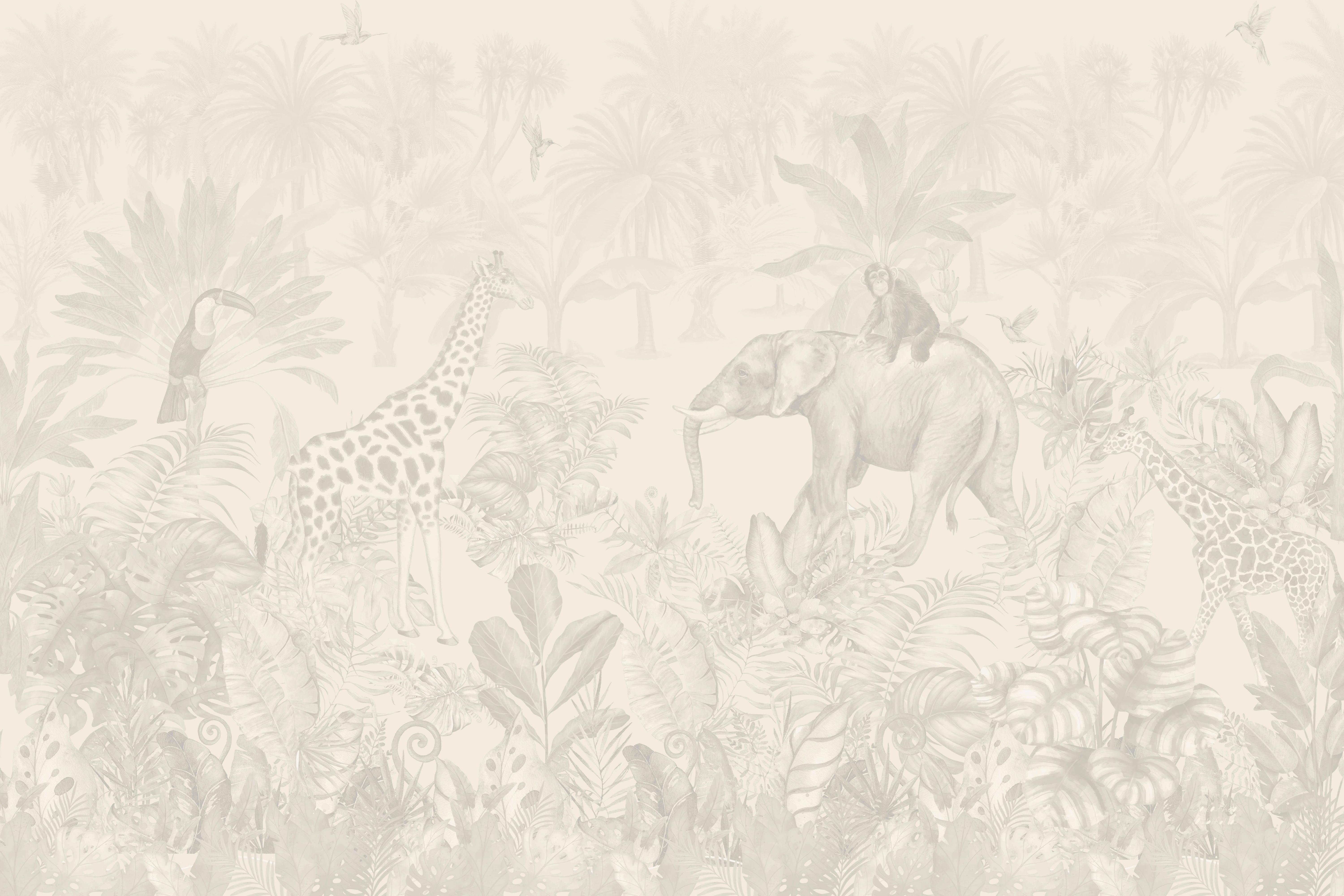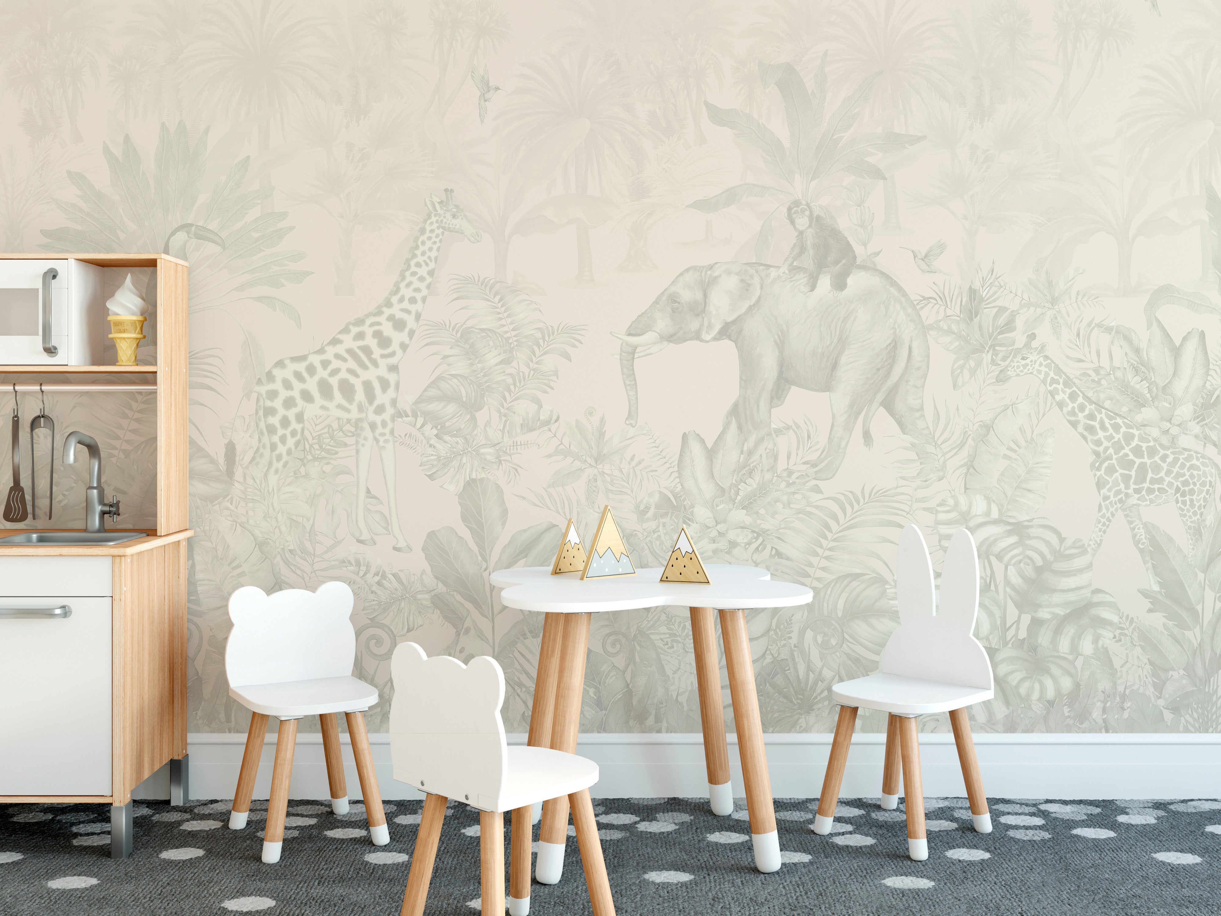 The beige jungle wallpaper mural is the perfect choice for creating an adventurous and imaginative kids room. This mural features a variety of jungle animals, including giraffes and elephants, surrounded by lush tropical foliage. The neutral beige tones make it suitable for any room while providing a vibrant backdrop for your child’s playtime. Crafted to inspire creativity, this mural helps your kids embark on daily adventures. Whether they are exploring the jungle in their minds or playing with their toys, this wallpaper brings excitement to their daily activities. Secure the Beige Jungle Wallpaper Mural today and turn any room into a safari adventure.