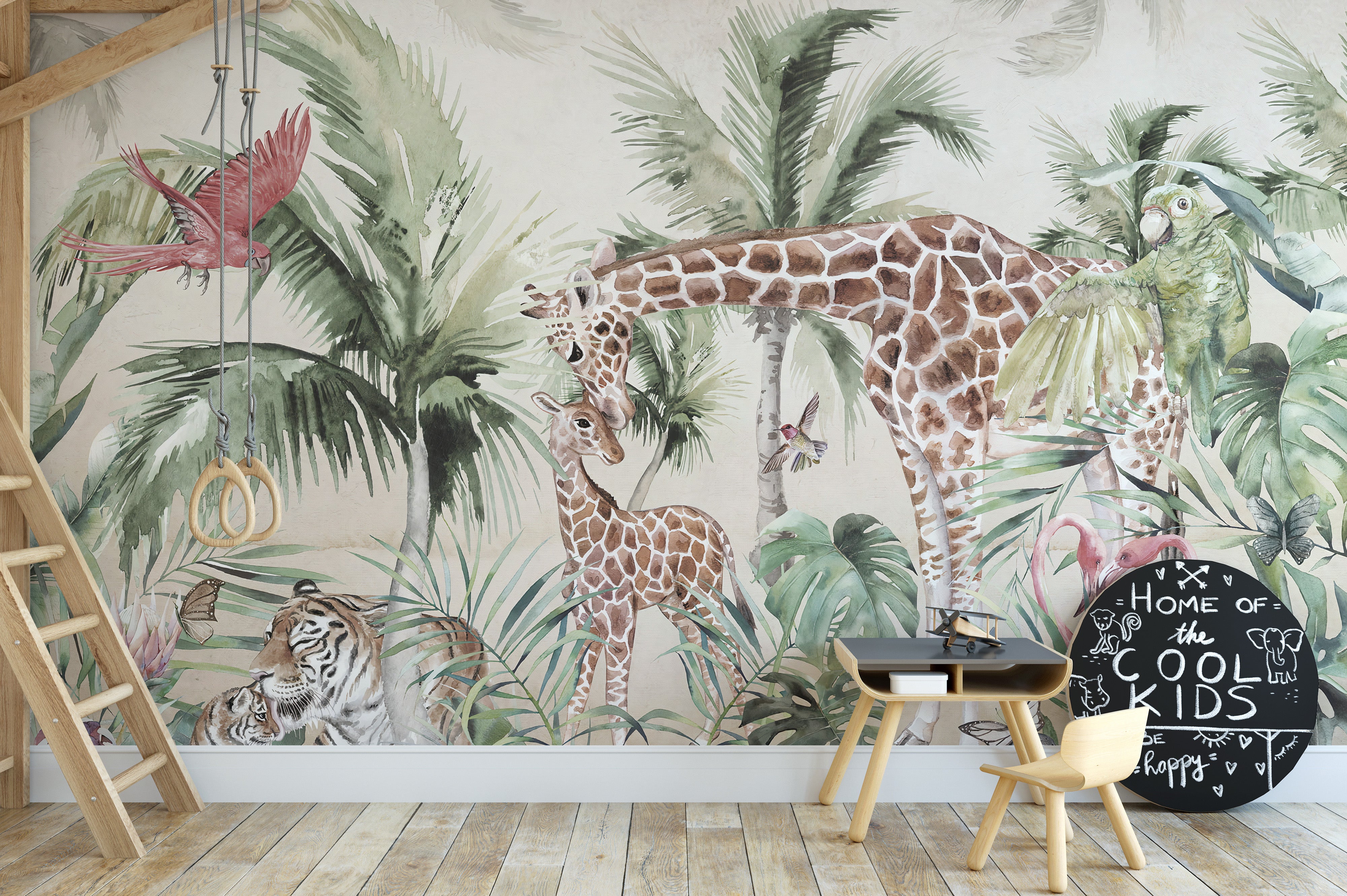 Escape to a world of vibrancy with tropical wildlife safari wallpaper. The intricate patterns and bright hues bring life to your walls and transport your mind to a lush and exotic jungle. A playful giraffe adorns the scene, adding a touch of whimsy to your decor. Embrace the call of the wild and create a space that ignites your sense of adventure. This peel and stick wallpaper is perfect for those who crave the warmth and energy of the tropics but wish to bring it into the comfort of their home. It's time to let your walls speak and add a touch of the tropics to your decor.