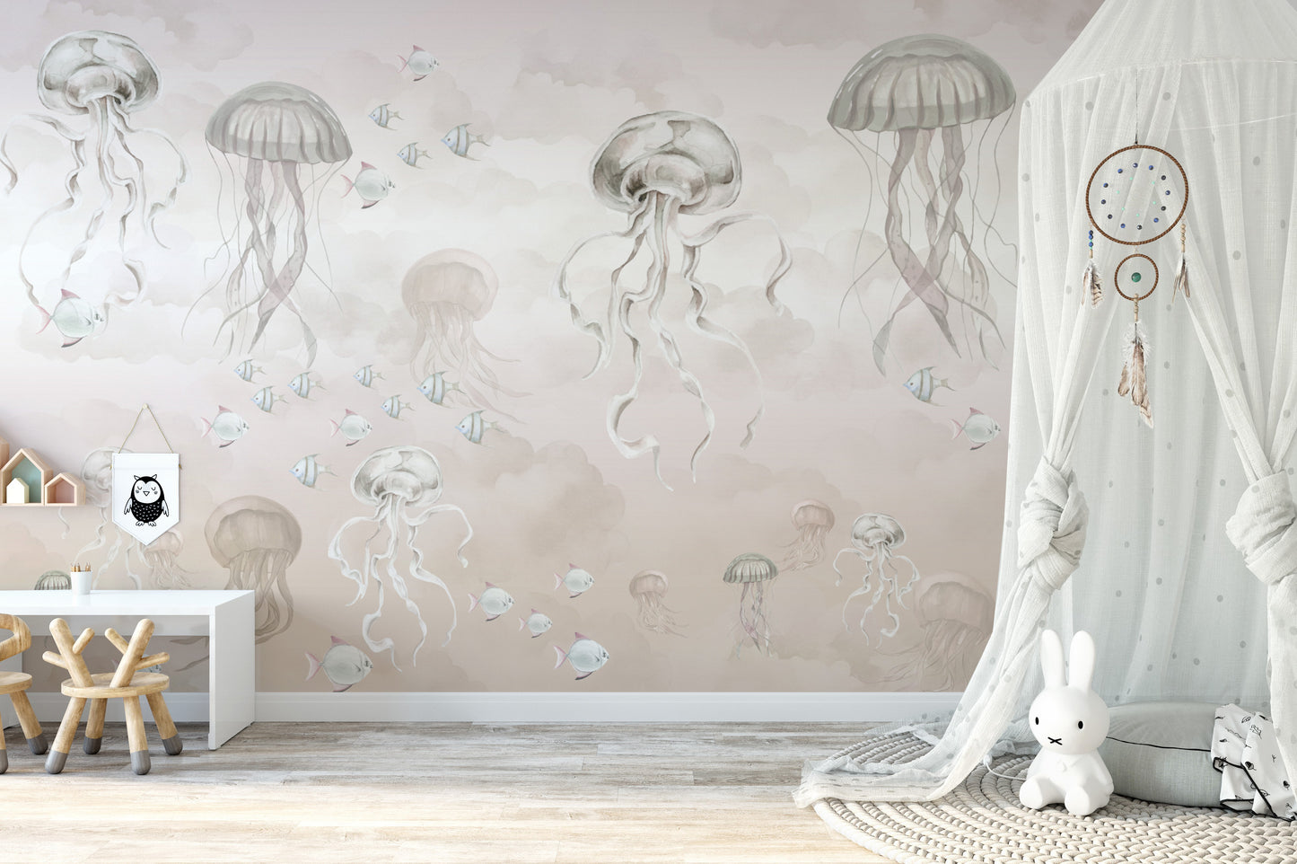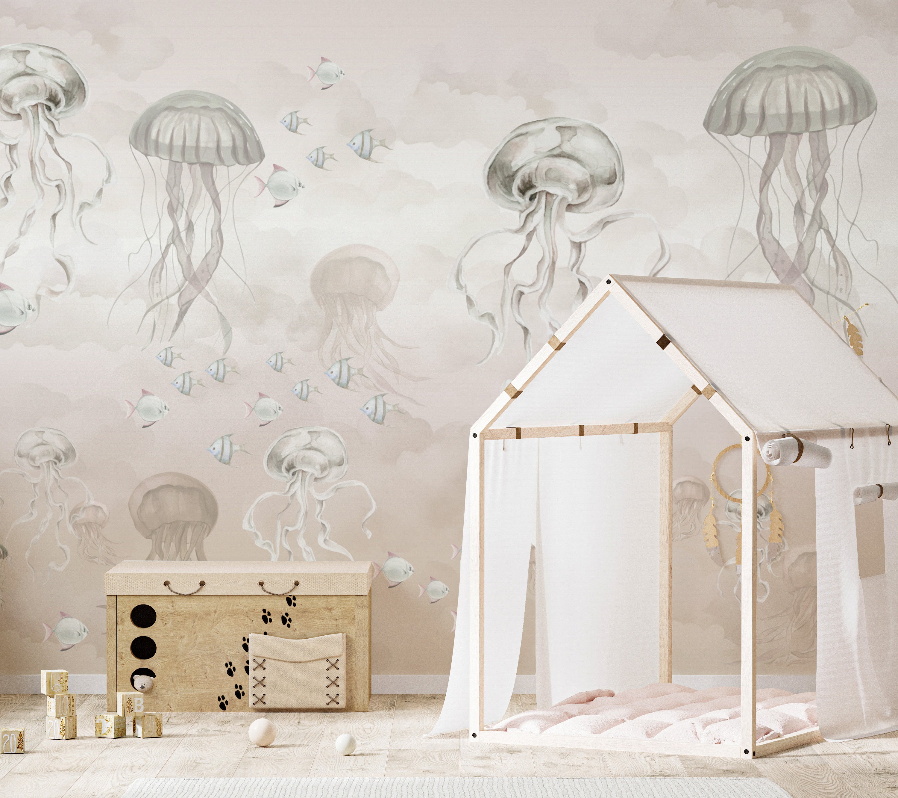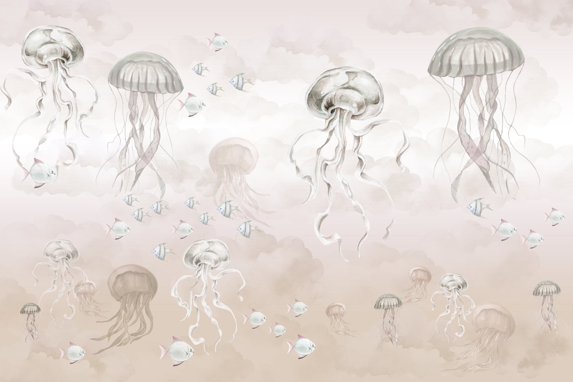 The beige watercolor jellyfish wallpaper creates a serene underwater scene with soft jellyfish drifting through muted beige tones. Delicate fish swim alongside, adding movement to this soft ocean wallpaper mural. The hand-drawn watercolor details bring a natural elegance, making it an ideal serene marine life wallpaper for calming spaces. The neutral palette blends effortlessly with various interiors, enhancing the soothing effect of this beige underwater wallpaper. Designed to capture the beauty of the ocean, the gentle floating elements in this ethereal ocean wallpaper for walls add a peaceful touch, perfect for bedrooms, nurseries, and coastal-inspired settings.