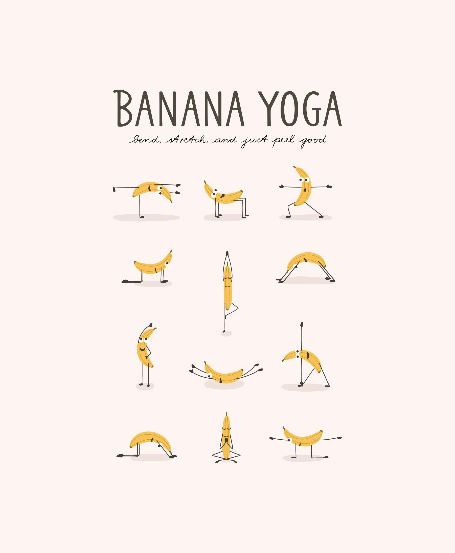 Fun yoga mural wallpaper featuring flexible banana illustrations.