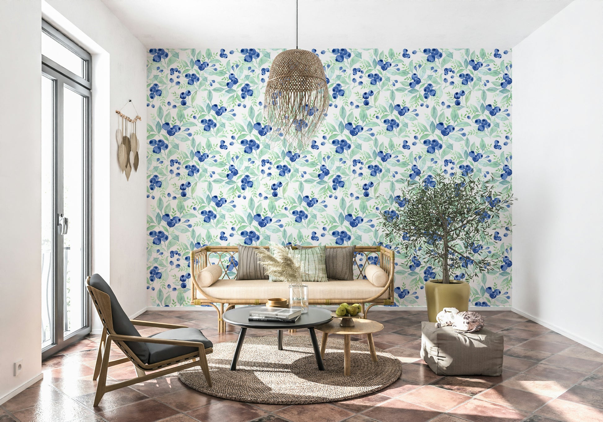 Bring a touch of nature indoors with this delicate blueberry watercolour pattern by Uta Naumann. This design features lush green leaves and juicy blue berries, all painted with a soft watercolour style. Transform your space with this wallpaper for walls and watch how it enlivens any room. It makes a charming choice for kitchens, dining rooms, or nurseries. Let this refreshing wallpaper enhance your home with a simple, natural touch and brighten your space. The tranquil colour palette complements a variety of interiors, making your space feel inviting and serene.