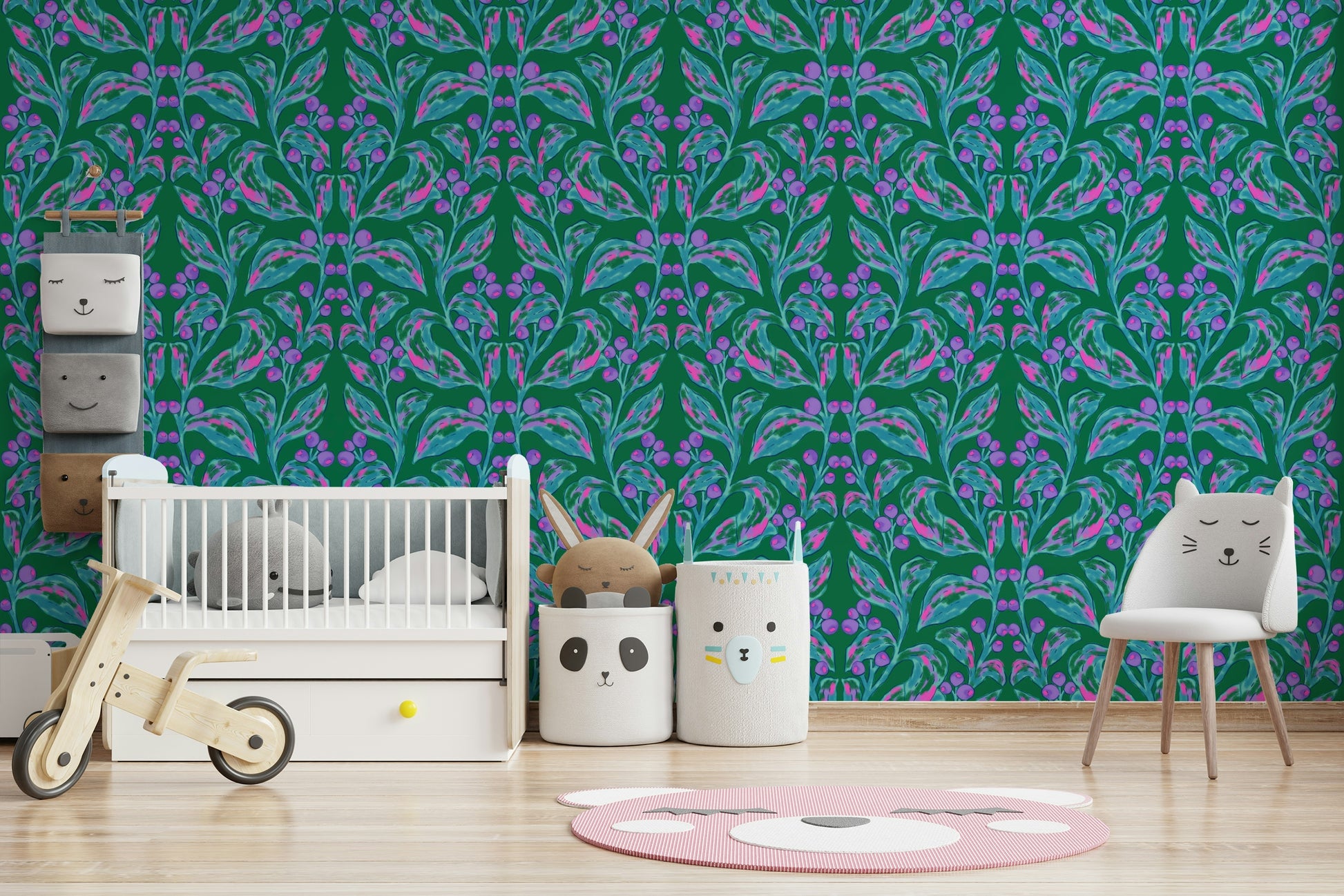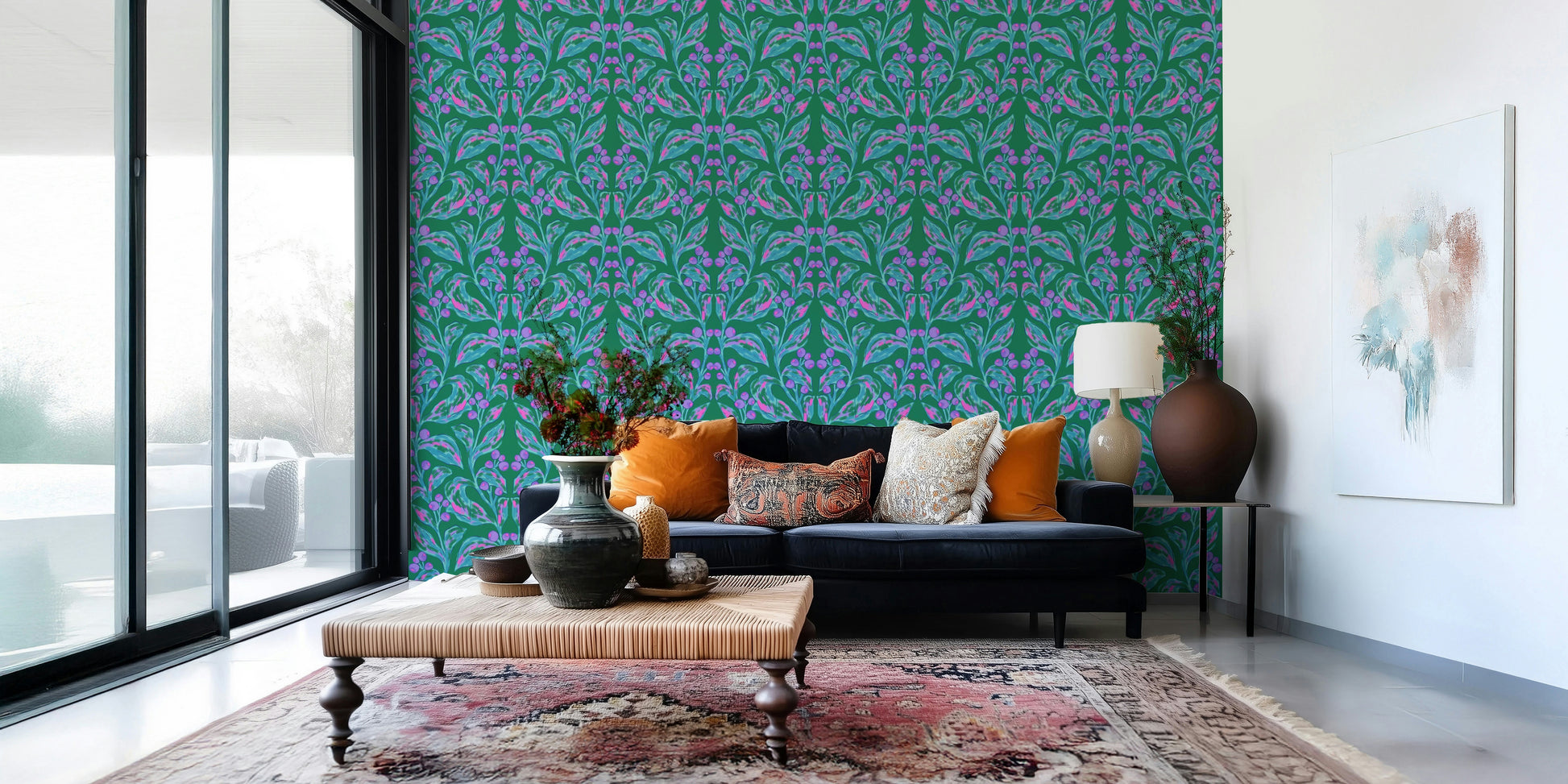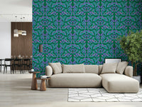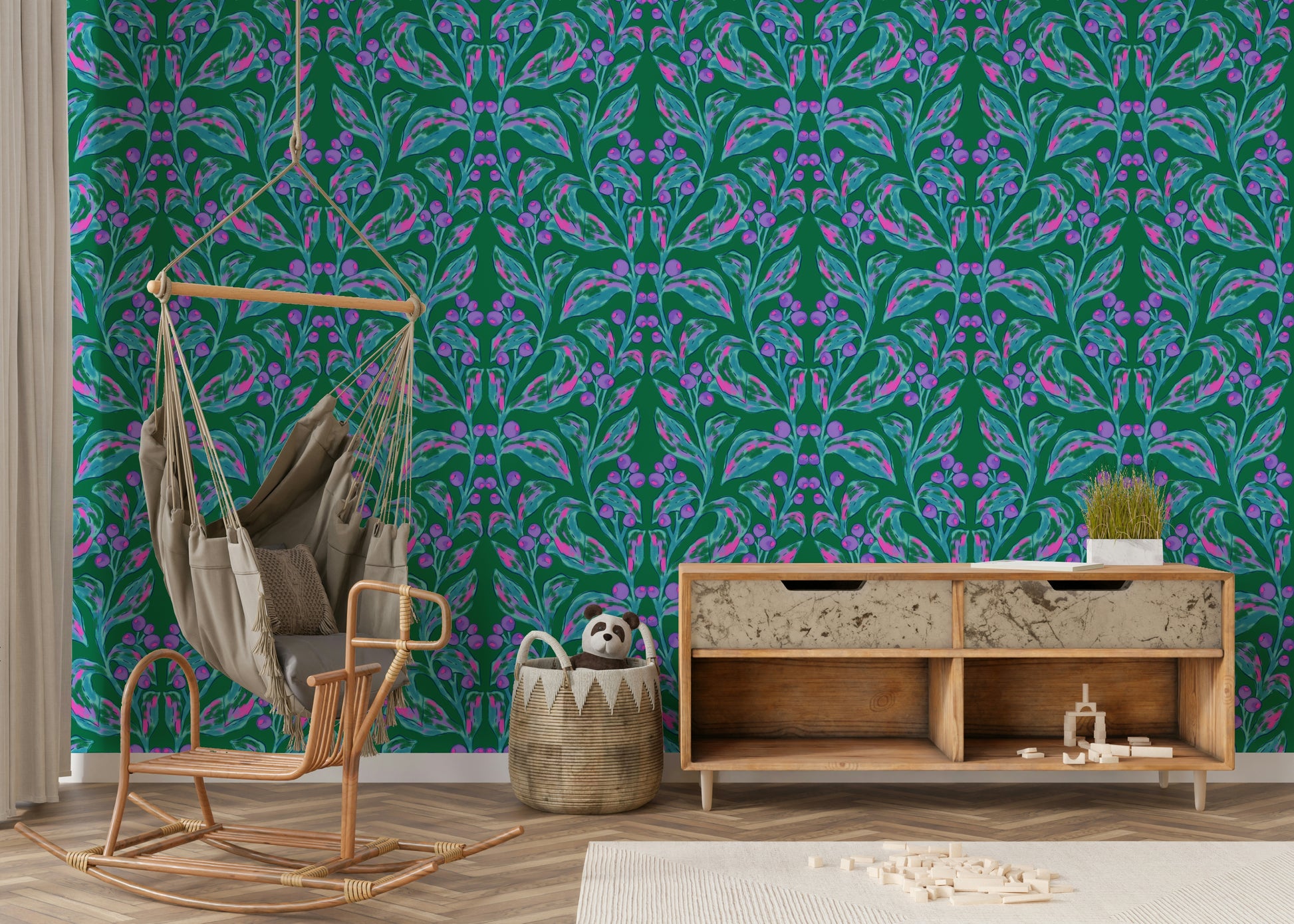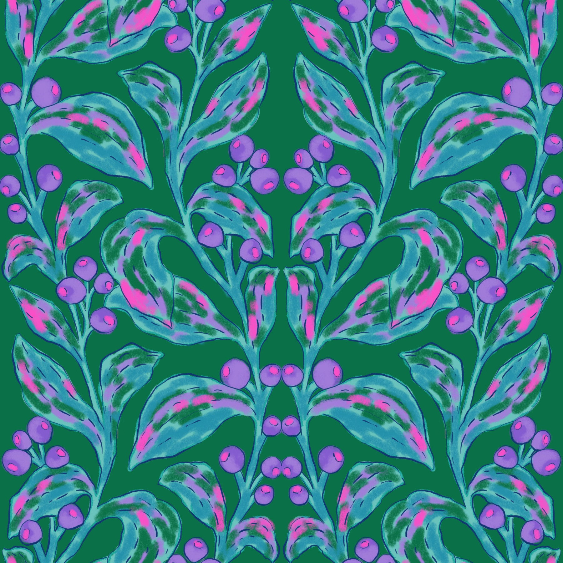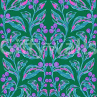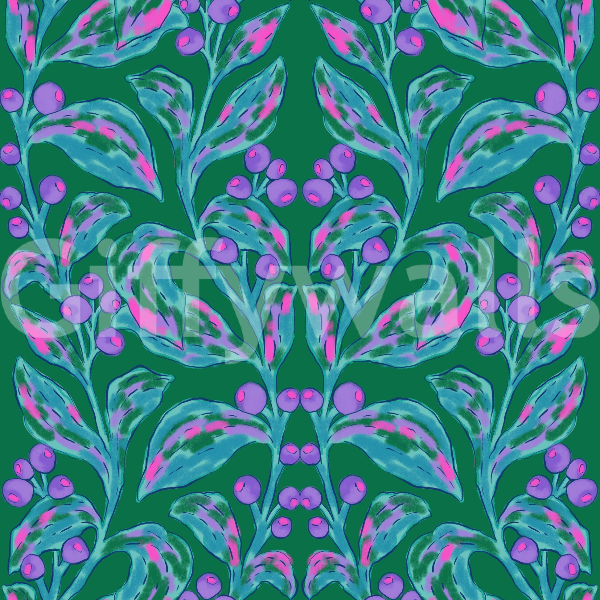 Introduce an artistic flair to your living spaces with this expressive botanical wallpaper for walls. The design features mirrored branches adorned with vibrant berries and textured leaves, crafted with a painterly style that brings depth and interest. Teal, pink, and purple hues blend harmoniously against a rich green backdrop, creating an inviting and cheerful atmosphere. Ideal for a dining room or living room, this wallpaper adds a unique touch, creating an interesting wall statement. The design complements both contemporary and traditional interiors, infusing a sense of nature and creative energy.