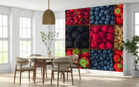 Variety of Berries on wooden box. Elevate your dining area or kitchen with this charming wallpaper for walls showcasing an array of fresh, vibrant berries. The design features strawberries, blueberries, raspberries, blackberries, and currants, neatly arranged in a wooden crate. This visually appealing wallpaper brings a touch of rustic charm and summer freshness into your space. The rich colours of the berries against the warm wood tones create a cosy and inviting atmosphere, ideal for breakfast nooks, pantries, or even a cheerful child's room. This wallpaper adds visual texture and interest, making it a delightful focal point that easily complements both modern and traditional decors.