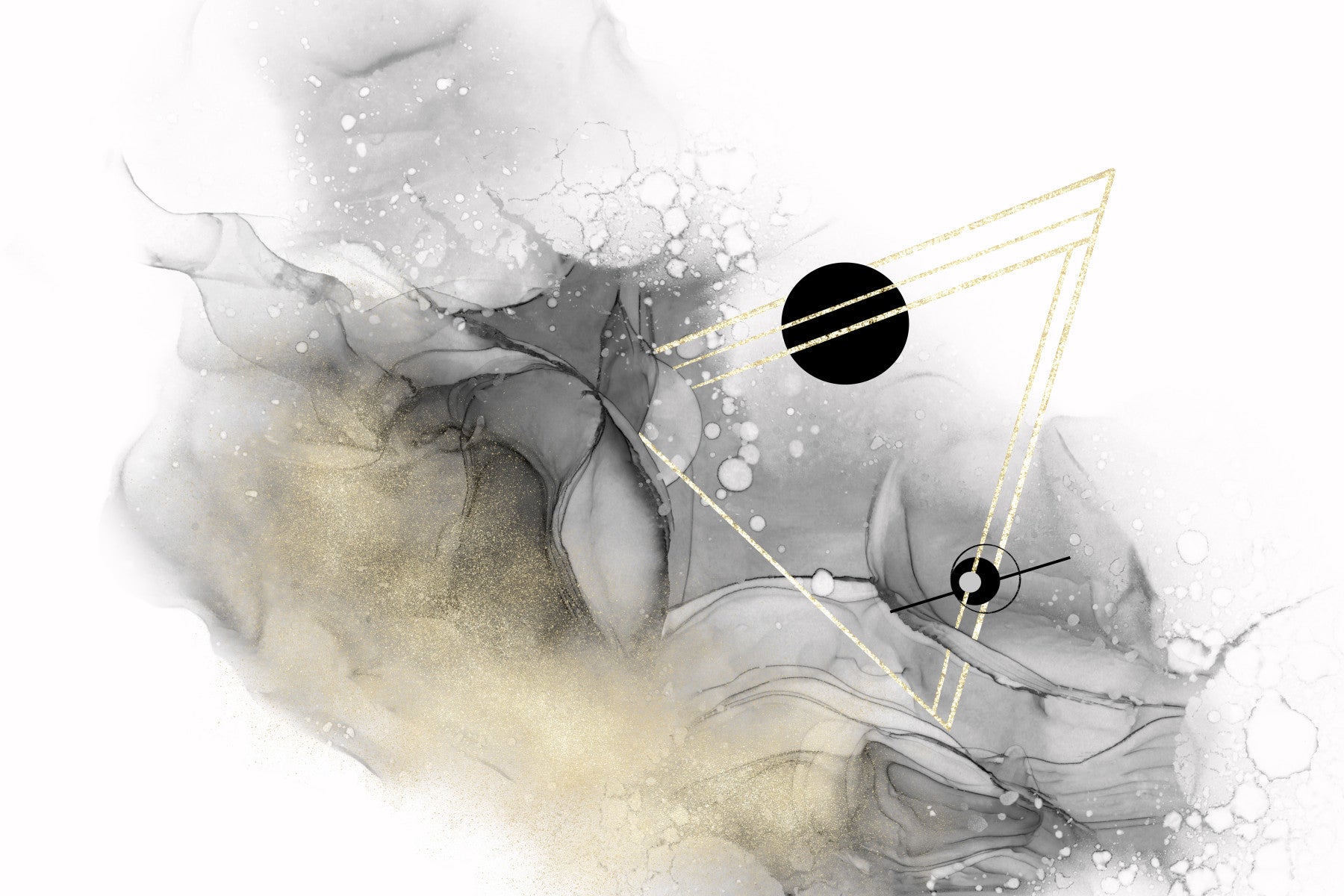 Journey beyond the known universe with this breathtaking wallpaper. Swirling nebulae of grey and silver, reminiscent of cosmic dust clouds, are punctuated by elegant gold geometric lines and stark black circles, suggesting distant planets or celestial bodies. The subtle glitter evokes a sense of stardust, adding a touch of ethereal magic. This abstract design captures the mystery and wonder of the cosmos, inviting contemplation of spaces far beyond our own galaxy, a serene and stylish depiction of the infinite expanse.