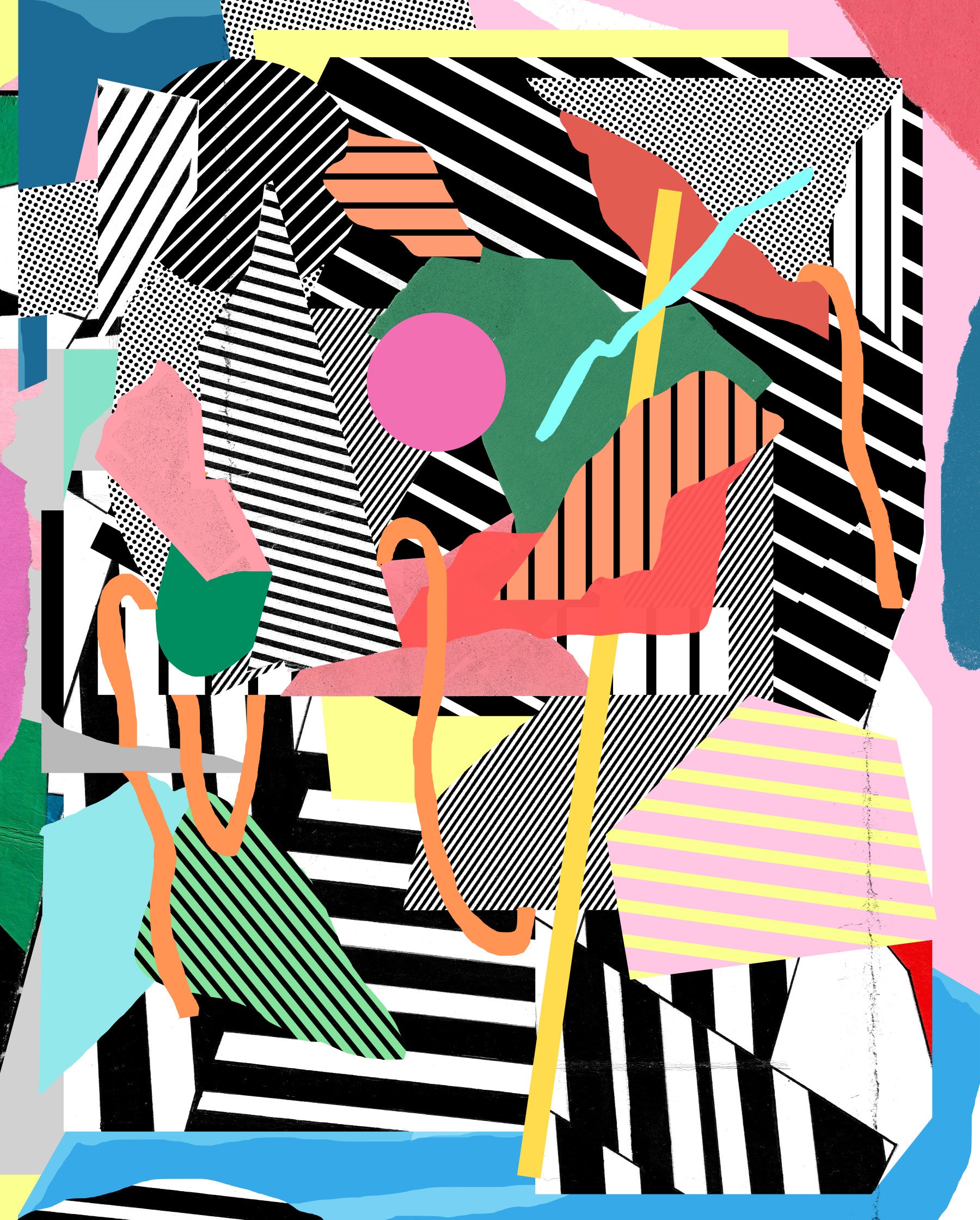 Transform any room into a vibrant, statement space with 'Big Wall'. This bold wallpaper design features a dynamic collage of shapes, patterns, and textures, creating a visual feast for the eyes. Striking black and white stripes collide with playful pops of color like coral, teal, and bubblegum pink, resulting in a modern, energetic aesthetic. The diverse elements, from polka dots to linear forms, are layered to create depth and intrigue. "Big Wall" is not just a wallpaper; it's an artistic declaration. Ideal for adding a touch of contemporary flair to living rooms, bedrooms, or creative spaces. Let the 'Big Wall' wallpaper be the centerpiece of your décor, a constant source of inspiration and visual excitement.