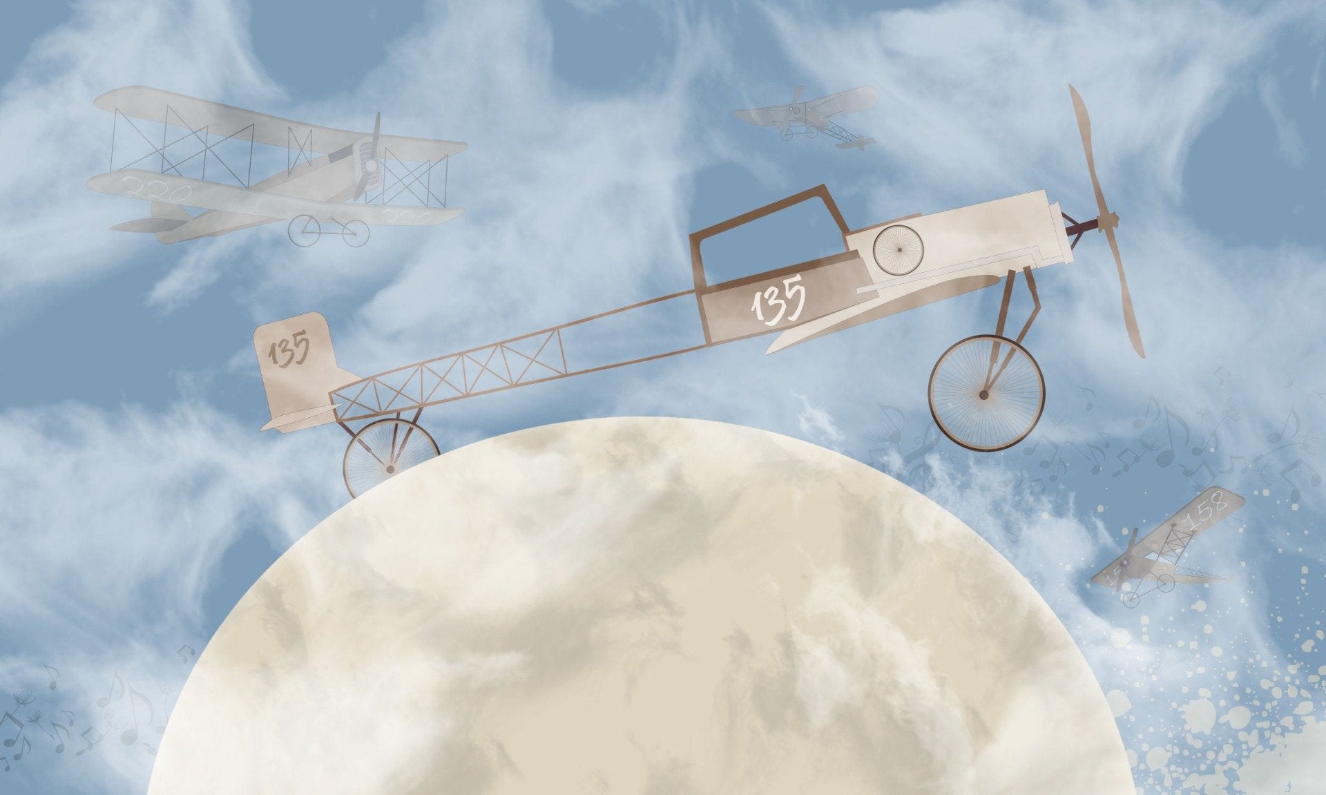 Set the stage for adventure with the biplane planes moon kids room mural wallpaper, a delightful addition to any young aviator's playroom. This kids room wallpapertakes children on a whimsical journey through the clouds, featuring vintage biplanes that sweep gracefully over a dreamy moonscape. The soft hues of the sky mingle with the moon's ethereal glow, creating a dynamic scene of aerial exploits. Notes of music drift among the planes, suggesting the joyous symphony of flight. This playful design brightens the room and encourages little ones to let their imaginations soar to new heights. It's an artistic celebration of the golden age of aviation, perfect for inspiring daydreams of soaring through boundless skies in a world where the ceiling is merely the beginning.
