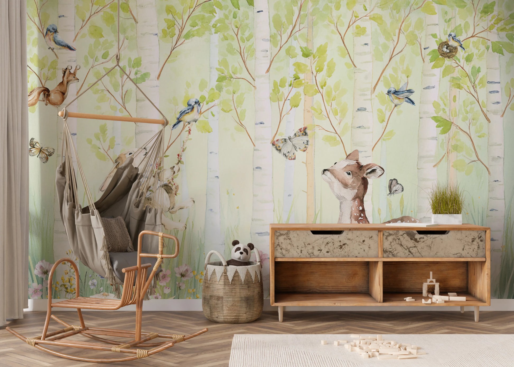 Invite a peaceful woodland scene into your home with this nature-inspired wallpaper for walls. The design displays a tranquil birch forest, inhabited by adorable animals like a bunny on a swing and a curious fawn. Watercolour techniques create a soft, dreamy quality, enhanced by a pastel colour palette. Perfect for bringing a sense of calm to a bedroom, playroom, or nursery. This wallpaper makes a wonderful accent, creating a serene and imaginative environment. See how it enlivens your space with quiet charm.