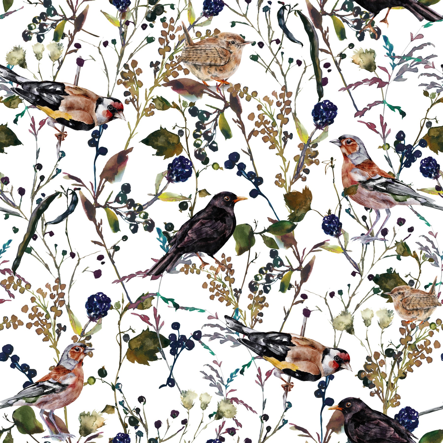 Invite nature inside with this charming wallpaper by Uta Naumann. Watercolor birds perch amidst delicate branches and ripe berries, creating a detailed pattern. Soft greens, browns, and deep blues blend on a white background for a fresh and inviting look. This wallpaper for walls brings a touch of the outdoors to your living room, bedroom, or dining area. Let the artistic design complement interiors by adding a peaceful, stylish focal point to the space.