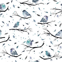 A serene watercolor wallpaper featuring charming robins perched on delicate, bare branches. The birds are rendered in soft aqua blues and muted purples, creating a calming and ethereal atmosphere. Scattered leaves and subtle teal accents add a touch of whimsy against the crisp white background. This design evokes a sense of peaceful winter tranquility, perfect for adding a touch of nature's elegance to any digital device. The simple yet elegant aesthetic makes it a versatile choice for various styles and preferences. Enjoy the subtle beauty of these birds finding solace amidst the winter branches.