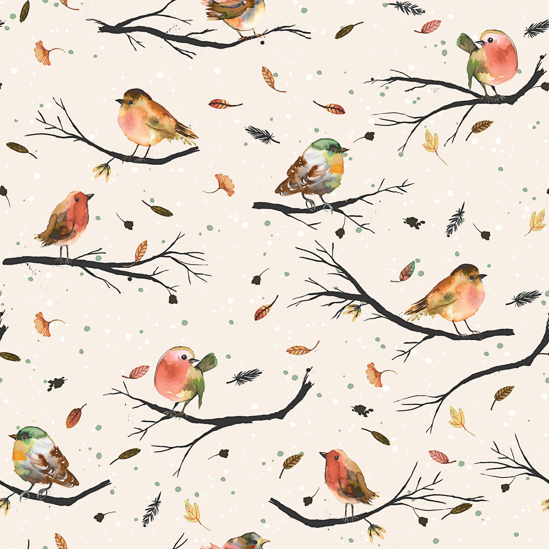 Embrace the serene beauty of autumn with this charming wallpaper. Watercolor robins in vibrant reds and oranges perch delicately on bare branches, their earthy tones complemented by the soft beige background. Falling leaves and subtle speckles add a touch of whimsical movement, creating a peaceful and captivating scene. The gentle palette and intricate detail evoke a sense of quiet contemplation, perfect for a calming and stylish digital backdrop. This artwork beautifully captures the essence of nature's transition, making it ideal for those seeking a sophisticated yet heartwarming aesthetic. Ideal for desktops, laptops, and tablets.