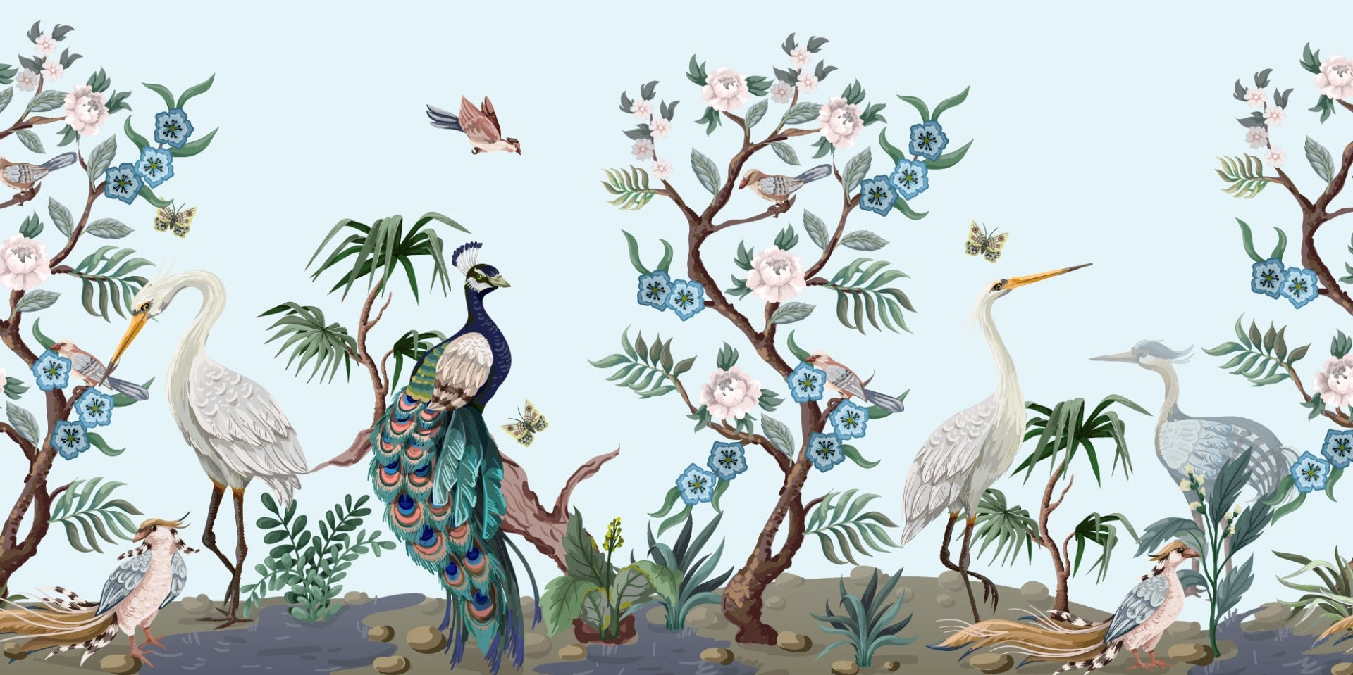 Unveil the elegance of your space with our chic avian chinoiserie wallpaper murals featuring beautifully painted birds like peacocks and herons, complemented by intricate floral and leaf designs. Each mural is crafted using purely natural materials, ensuring an eco-friendly and sustainable choice for your decor.