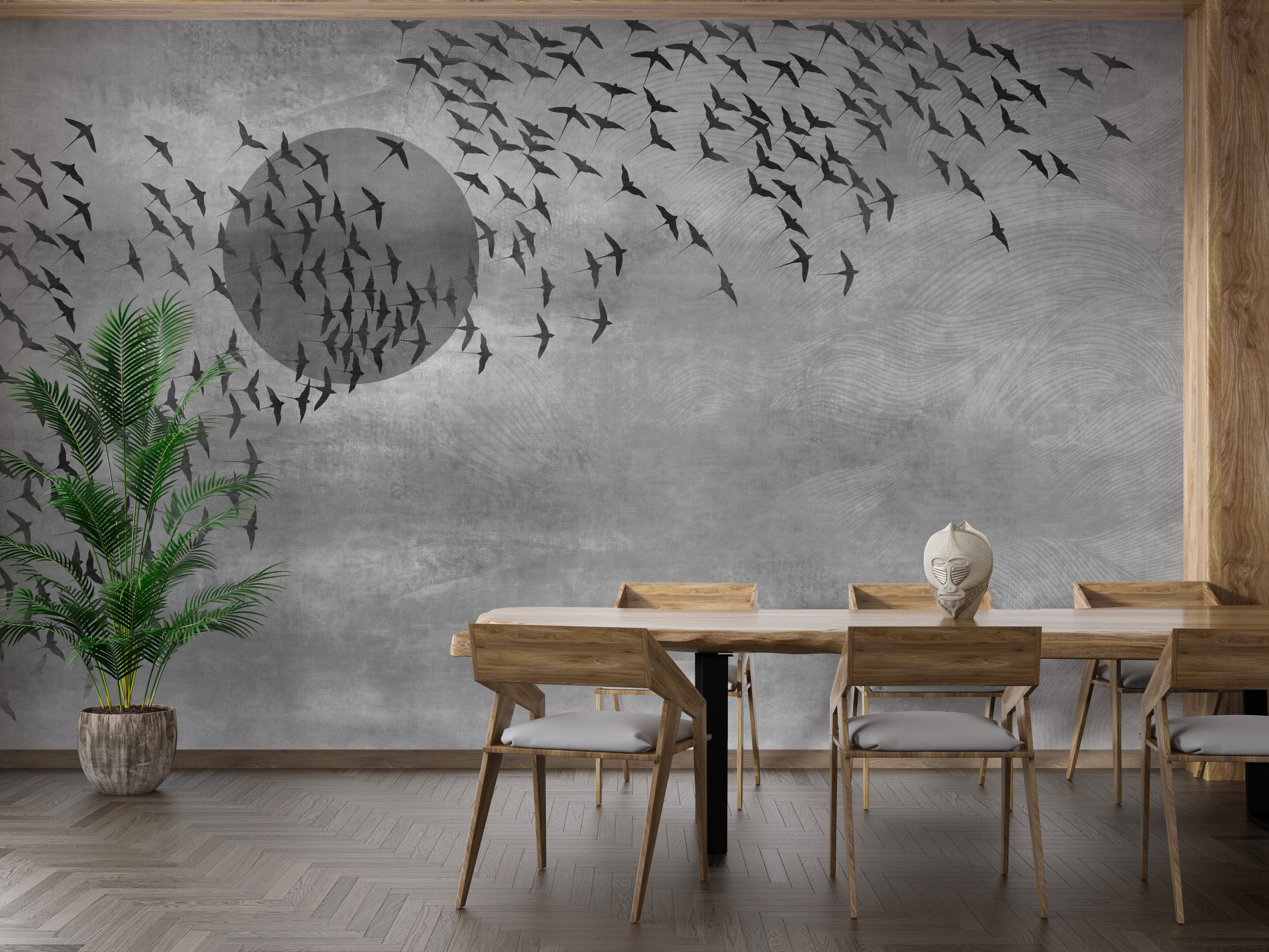 Add mystery to your home with this grey shady flock Halloween wallpaper and spooky wall covering. Grey and white in our mural create a neutral palette that complements any room. Ghostly birds flying give mystery and motion to the flock of birds wallpaper, making it unique and eye-catching.