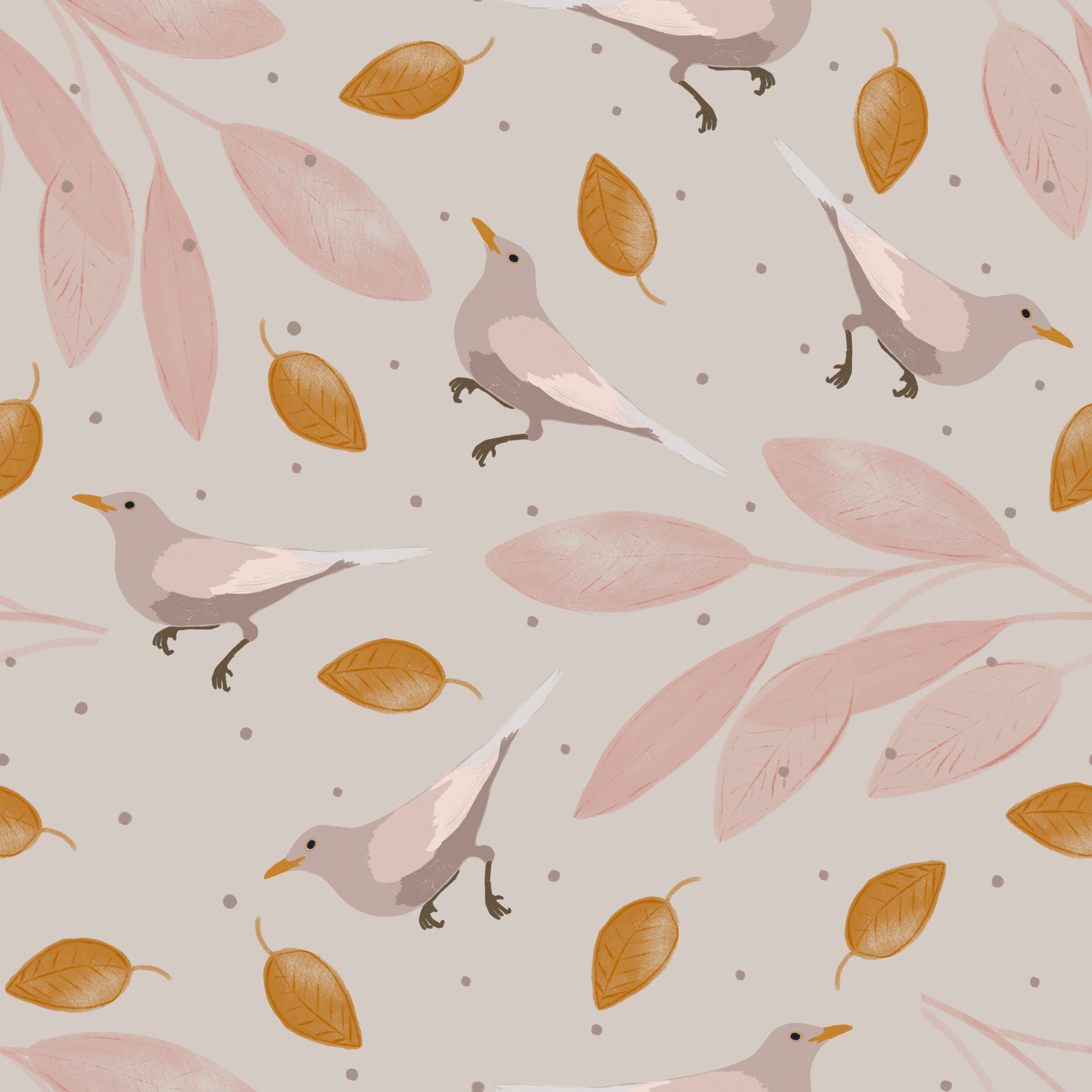 A delicate wallpaper pattern with graceful birds and blush-toned leaves scattered across a neutral backdrop.