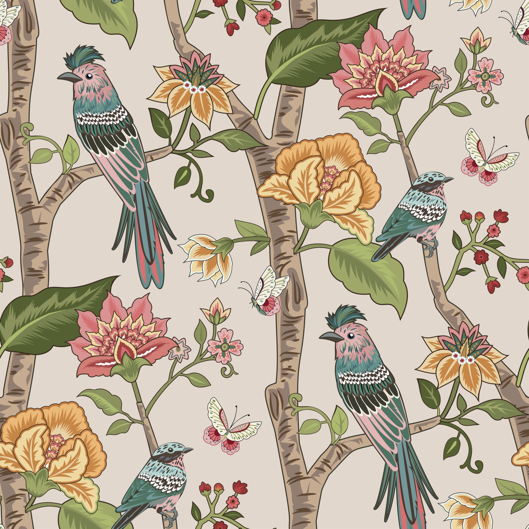 Patterned bird and floral wallpaper featuring vibrant blossoms and perched birds in a seamless layout.