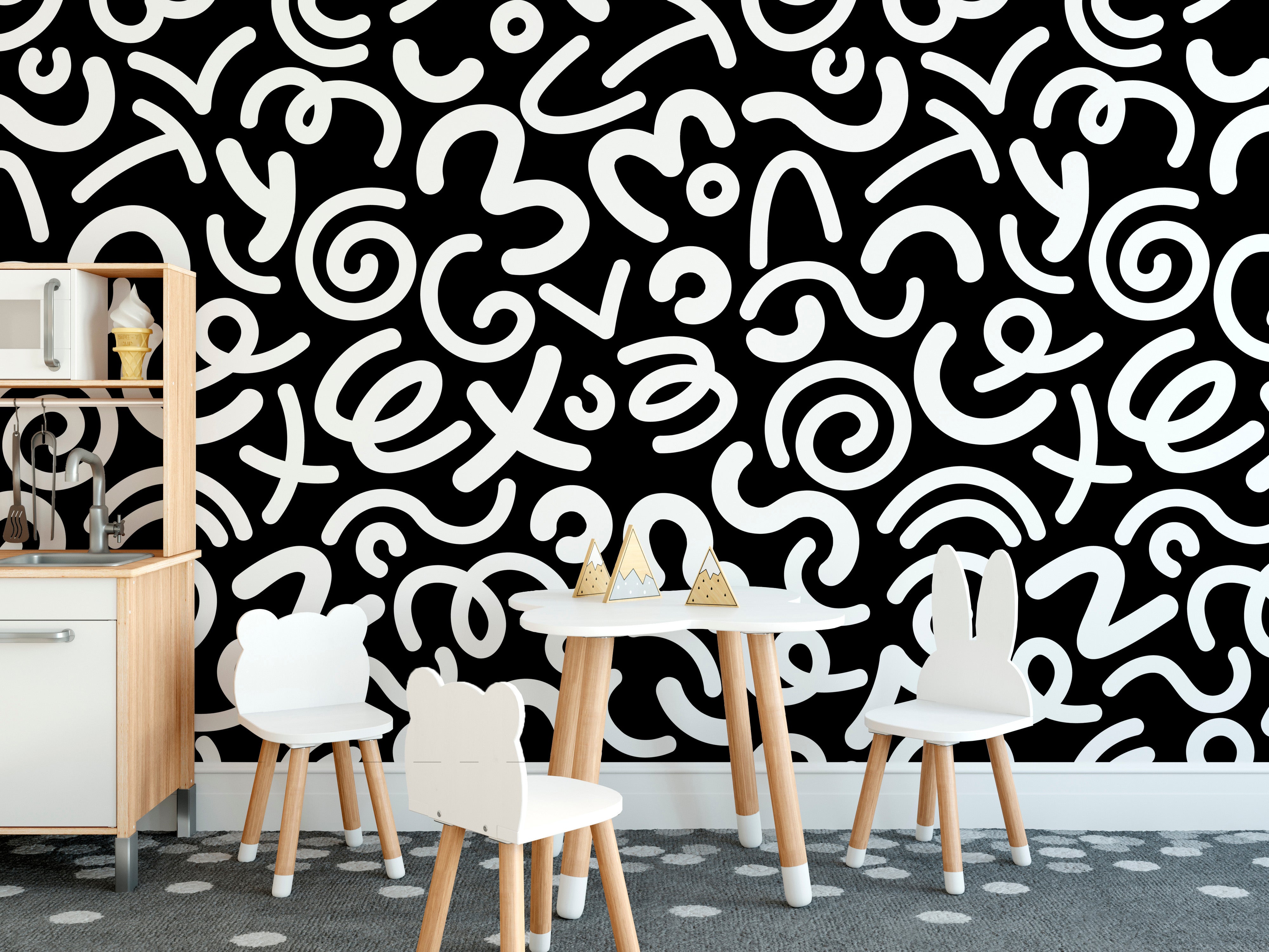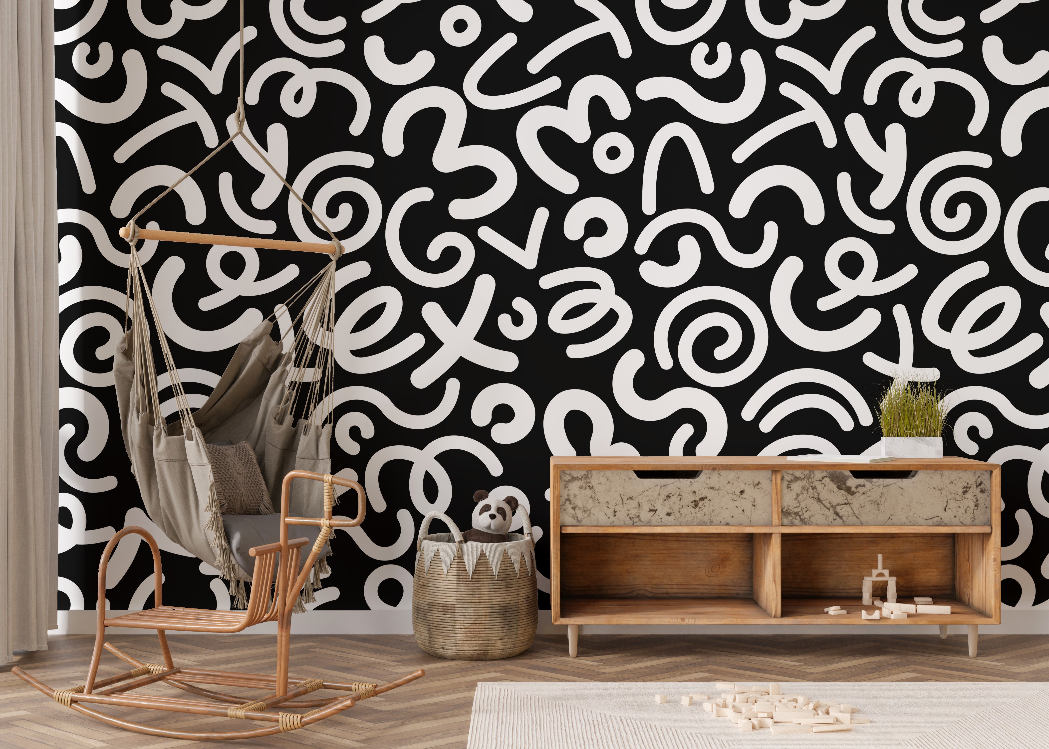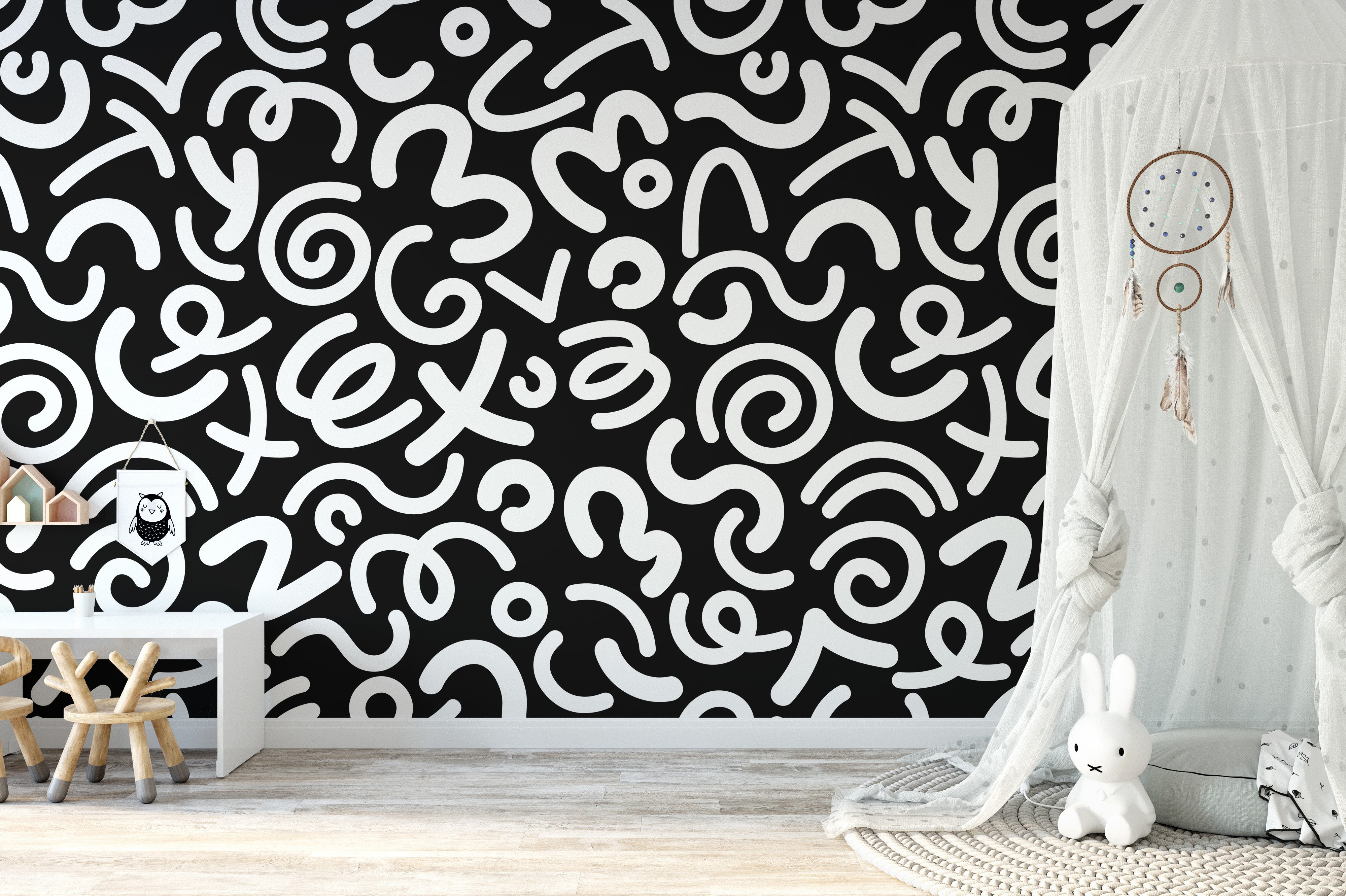 Add a dash of quirky style to your walls with the Abstract Black and White Doodle Squiggle Pattern Wallpaper. Its bold black background and striking white doodles provide an eye-catching contrast that is sure to be a focal point in your room. The wallpaper is perfect for areas that call for a modern, artistic feel, be it the bedroom, office, or hallway.