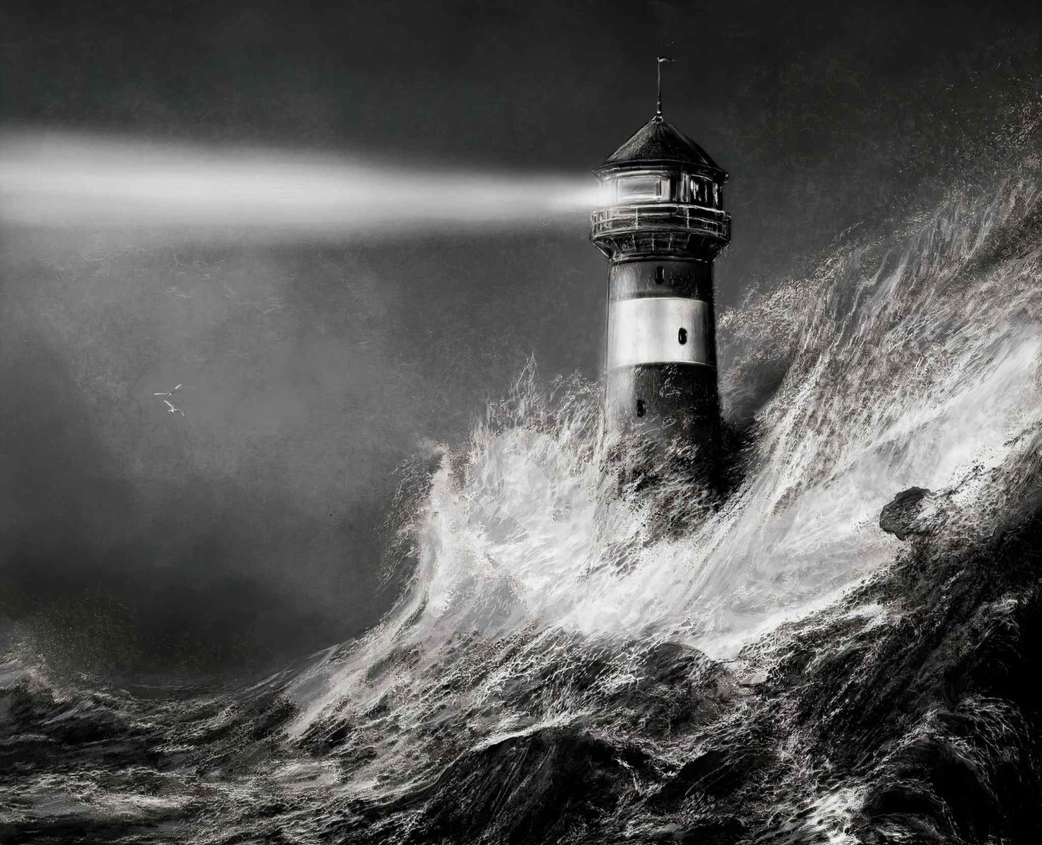 Stormy sea lighthouse black and white wallpaper