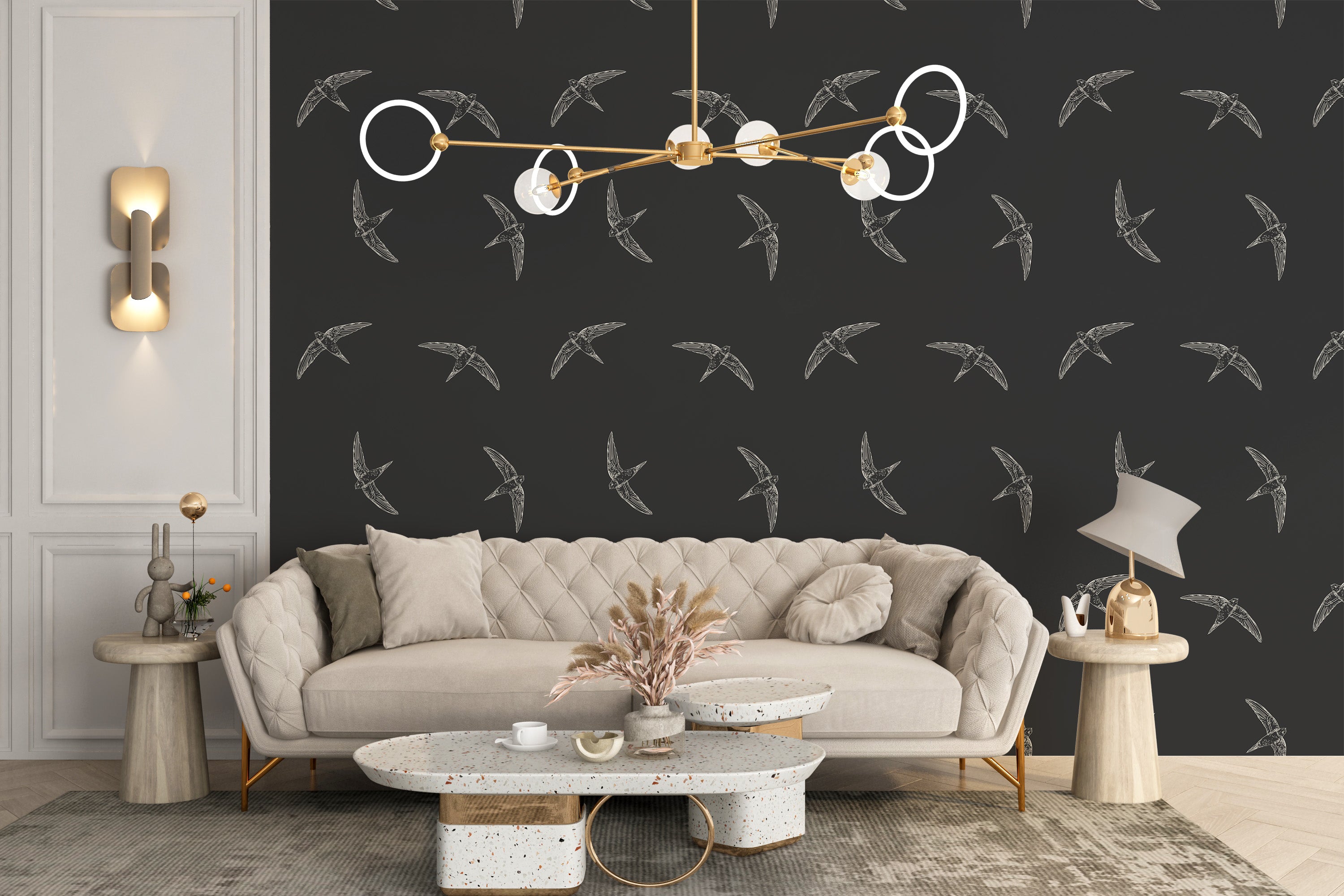 Elevate your space with the dynamic elegance of our Black Color Flying Swallow Bird Wallpaper. Featuring the silhouettes of swallows in flight against a striking black background, this design captures the essence of freedom and grace. The bold contrast and movement of the birds create a captivating visual effect, perfect for making a statement in any room. Whether you're looking to add depth to your living room, bedroom, or office, this dramatic flair black wallpaper offers a sophisticated touch that blends the beauty of nature with modern design sensibilities.