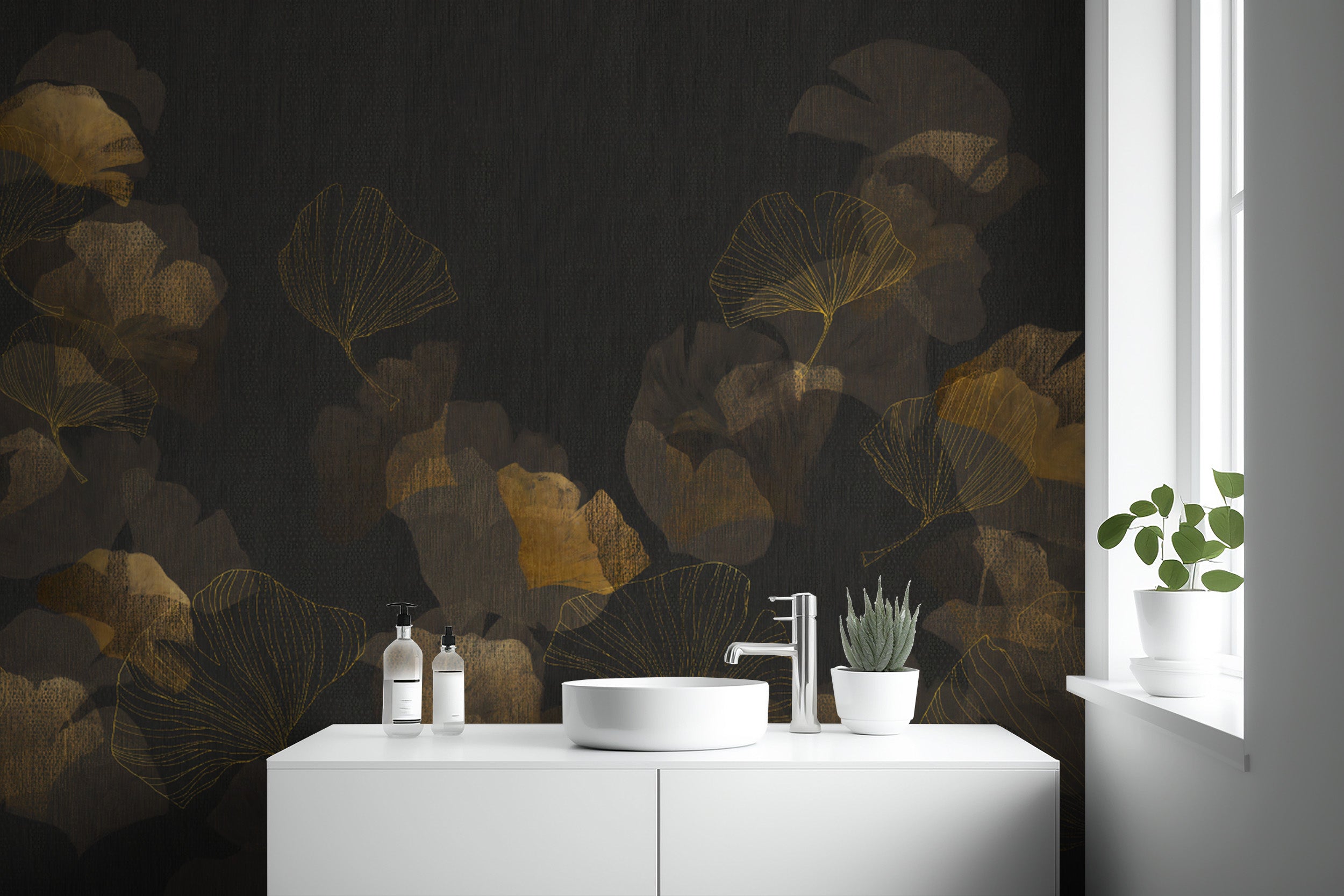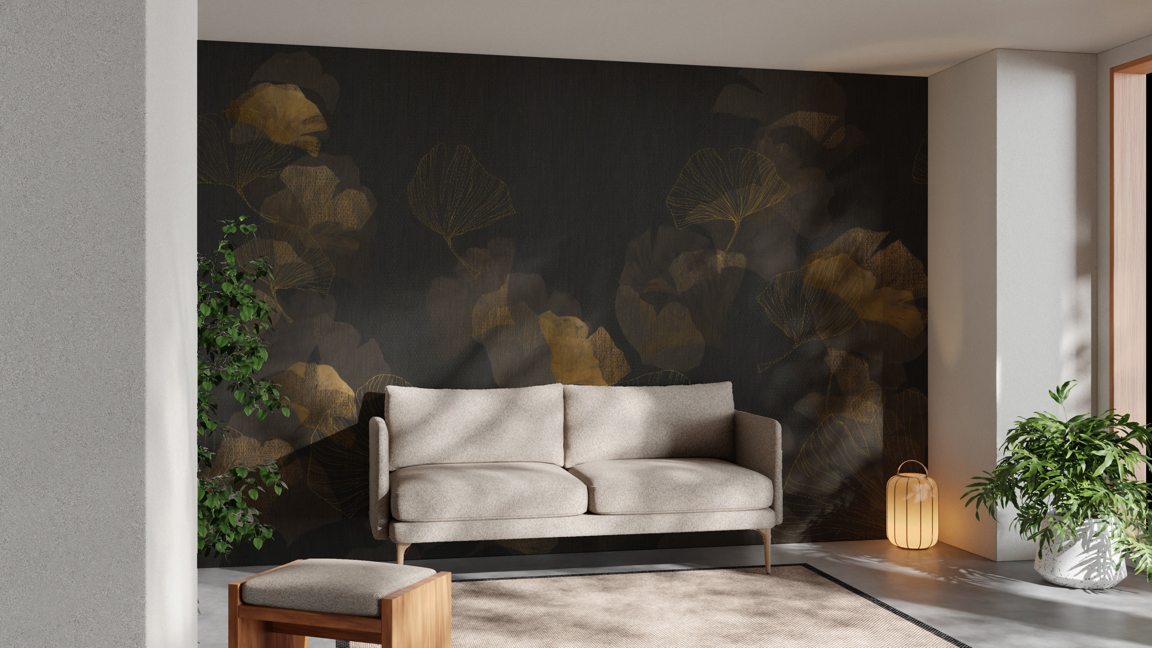 Luxurious black ginkgo wallpaper with soft gold highlights