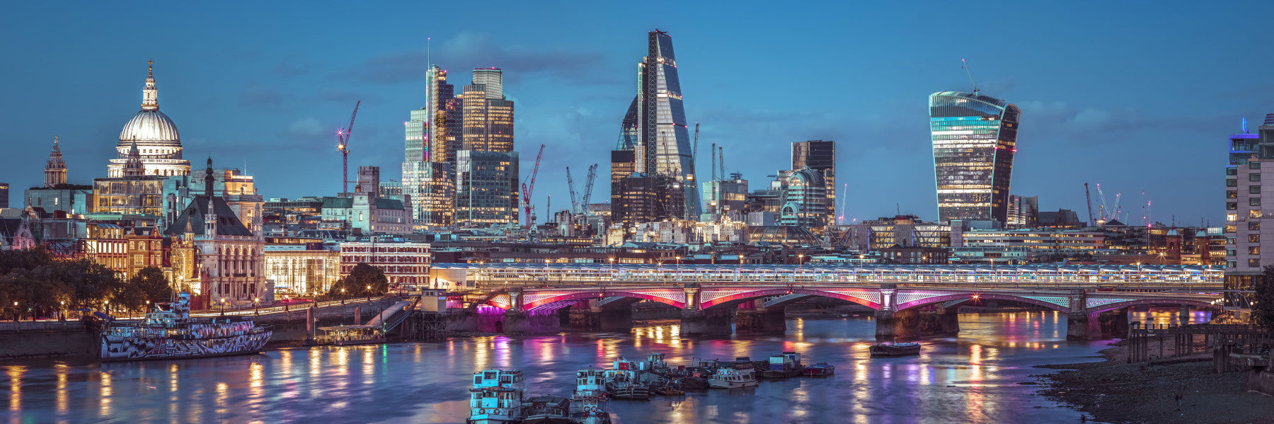 London cityscape mural featuring Blackfriars Bridge and skyscrapers