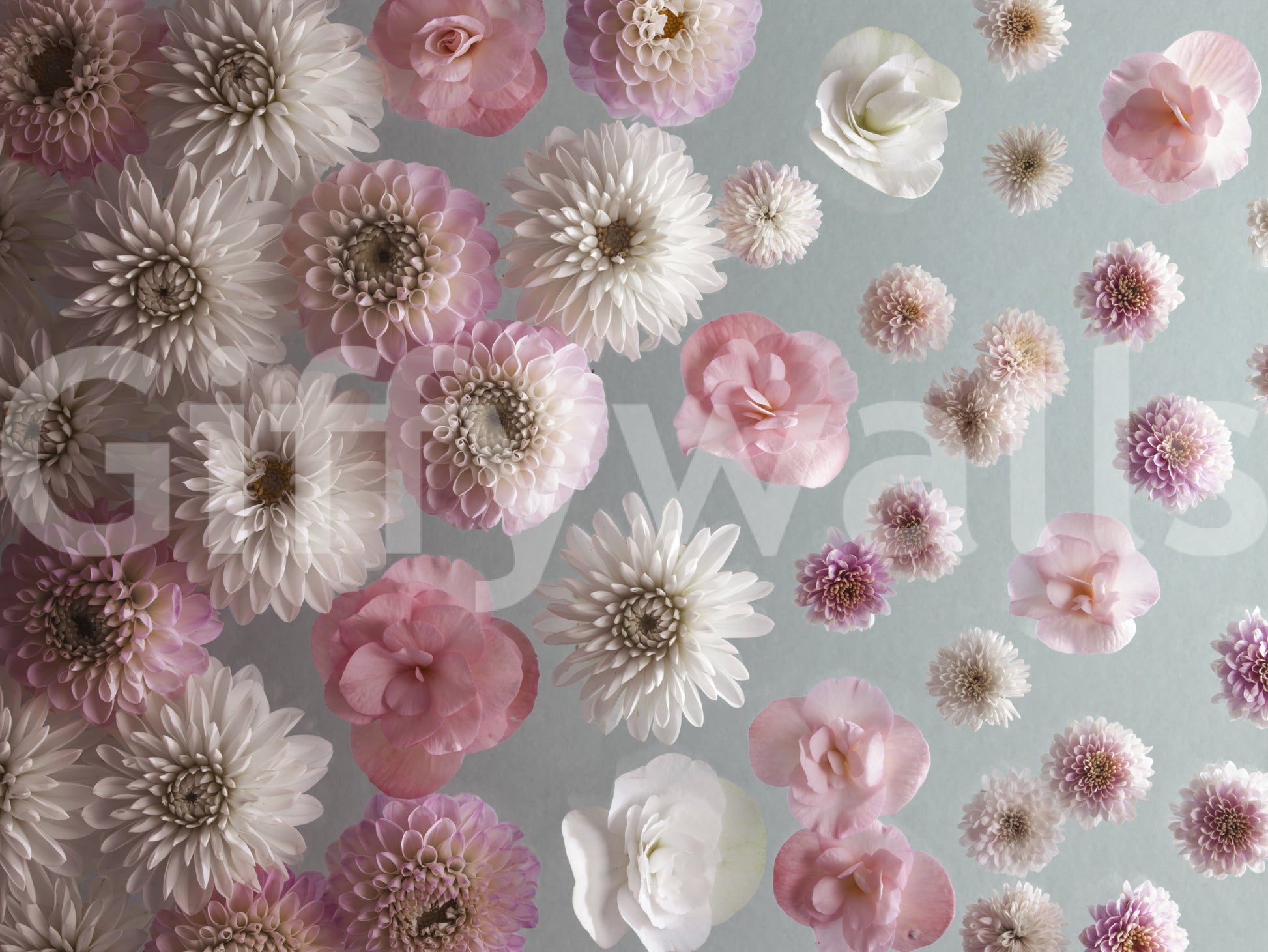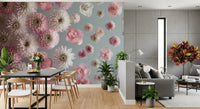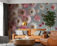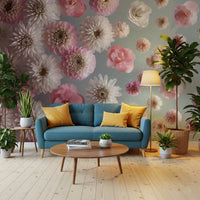 Transform your space with this stunning floral arrangement. Delicate dahlias, camellias, and other blooms create a serene, calming atmosphere in any room. The soft pink and white colour palette on a muted blue background evokes feelings of peace and sophistication. Ideal for bedrooms, living rooms, or hallways, this wallpaper for walls adds a touch of understated elegance. Enhance your home decor with its graceful design and refreshing style, bringing the beauty of a spring garden indoors. Perfect for creating a tranquil retreat.